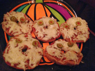 Using mini bagels (I like the whole wheat ones), add pizza sauce, shredded mozzarella cheese and sliced olives for eyes. Bake at 350 for about 10-15 minutes until cheese is melted and bottoms are crispy.