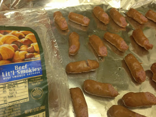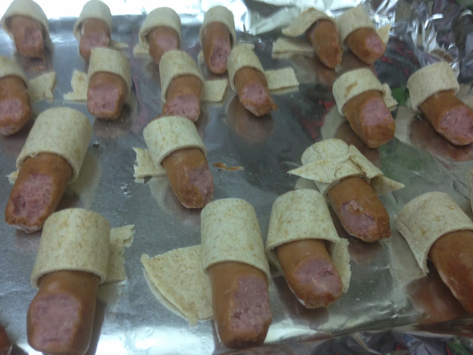 Wrap little smokies in slices of tortillas. Remove part of the smokie to make a slot for the ‘toe.’ Bake until warmed through and tortillas crispy.