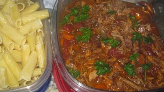 While meat is cooking (after an hour), bring salted water to a boil. Add pasta and cook according to the package until al dente. Drain pasta when cooked.
