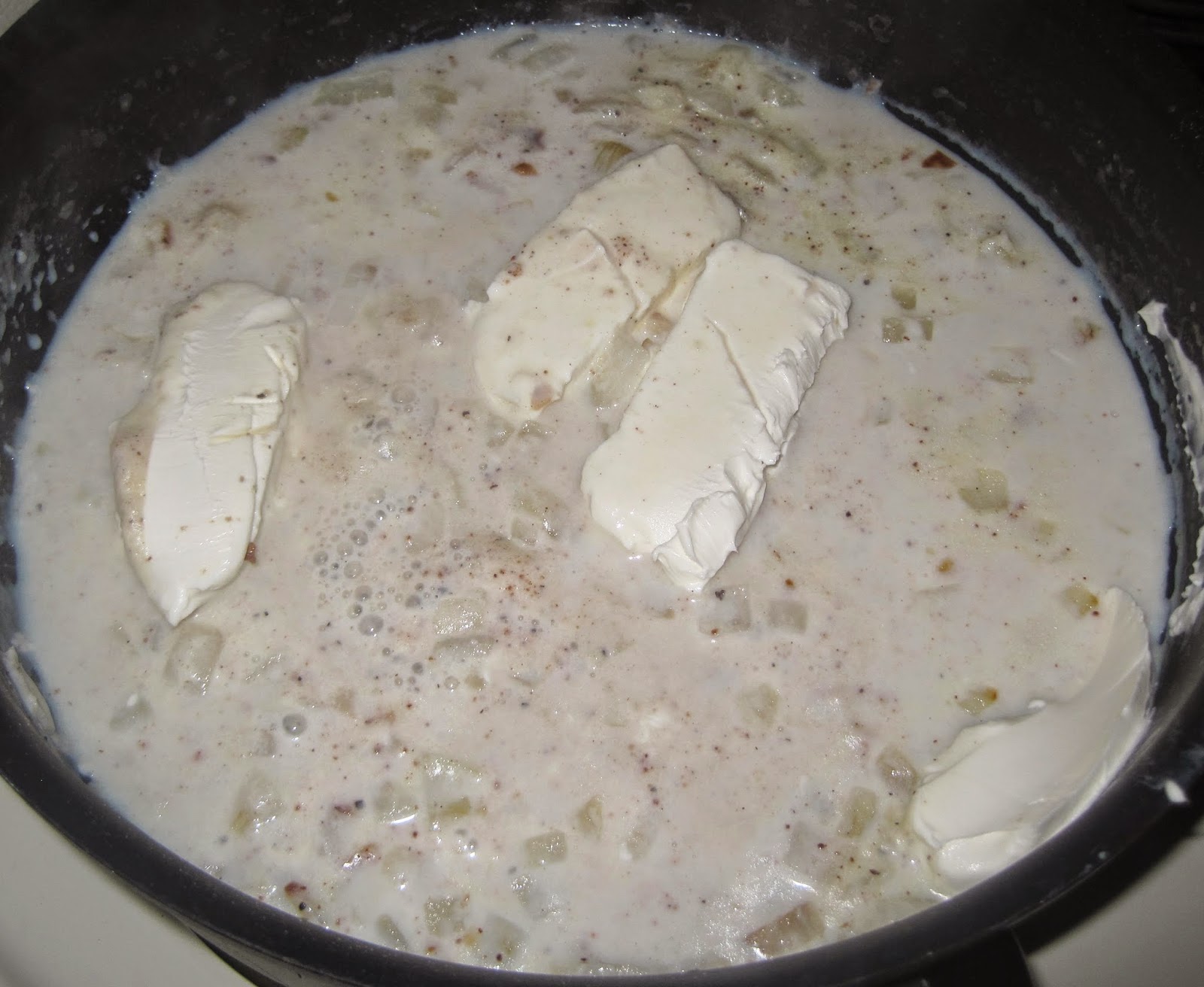 Slowly whisk in milk, parmesan cheese, nutmeg, salt, and pepper. Add cream cheese, continue to whisk until smooth.