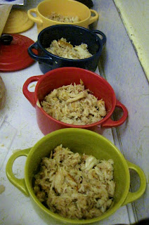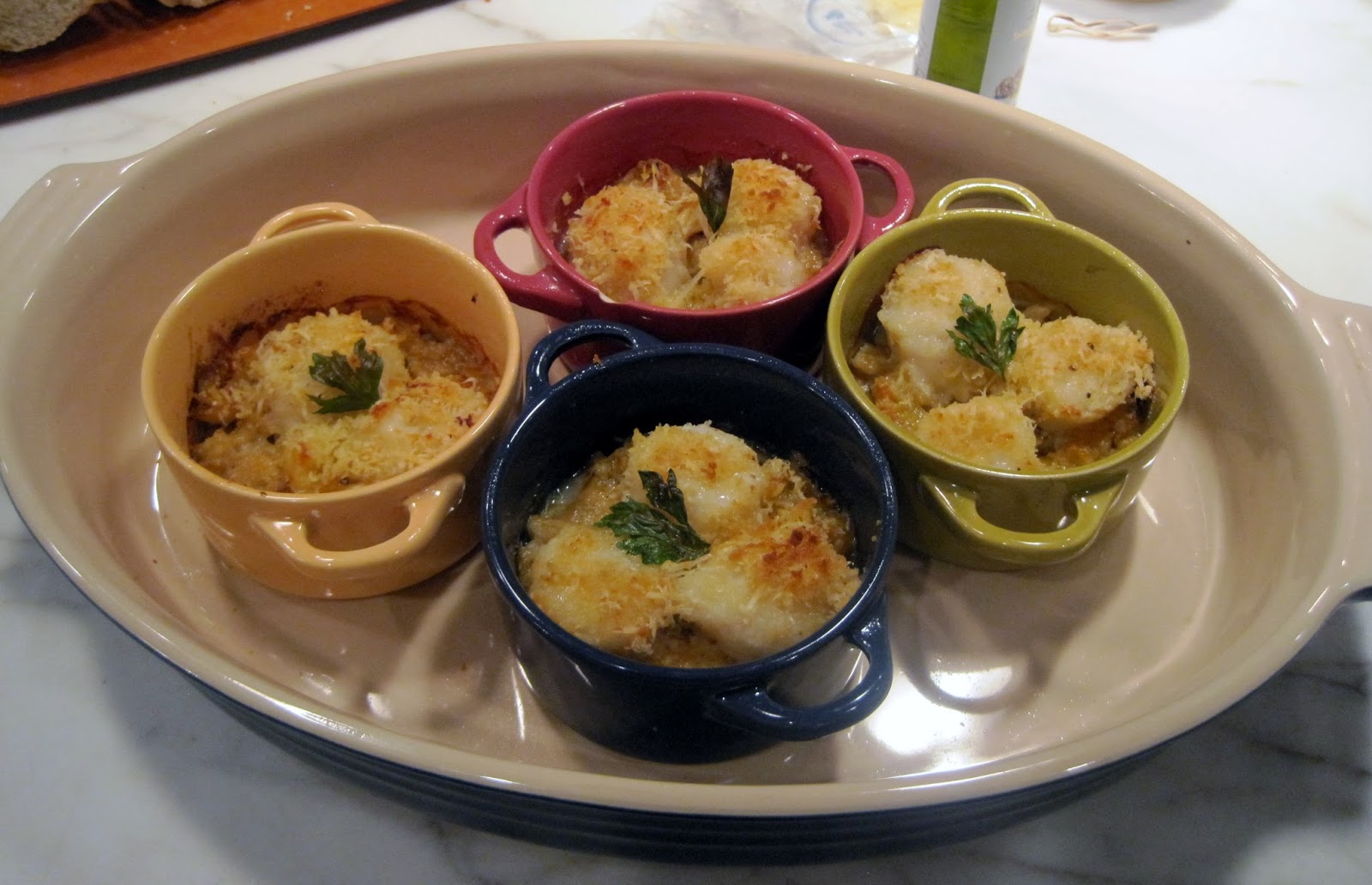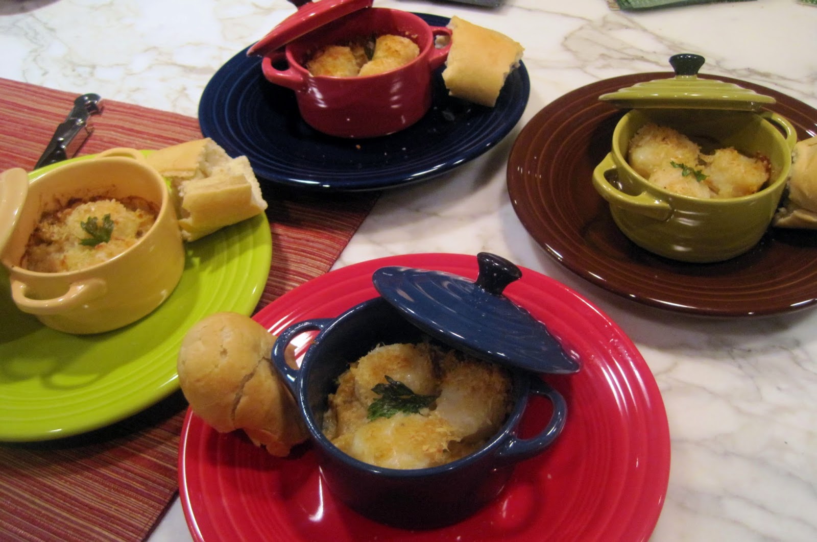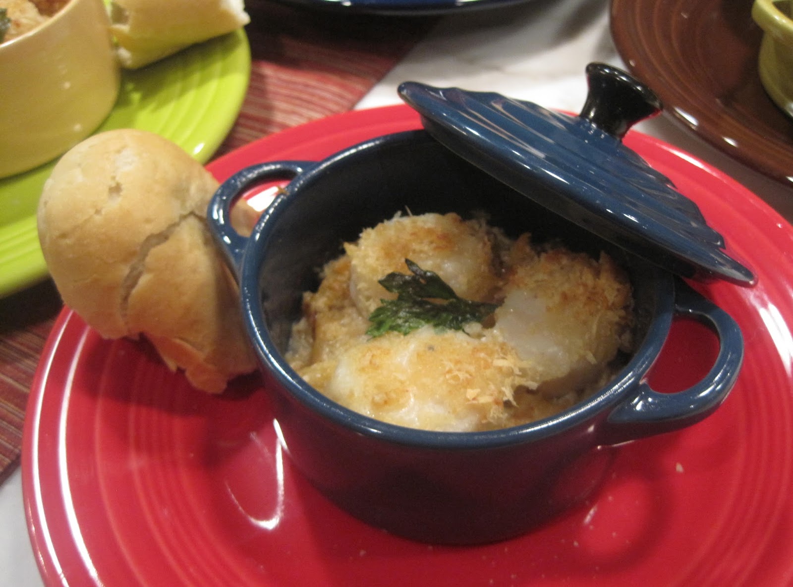 Arrange scallops and crab in a small baking dish or in individual ramekins sprayed lightly with cooking oil. (Layer crab, then top with scallops)