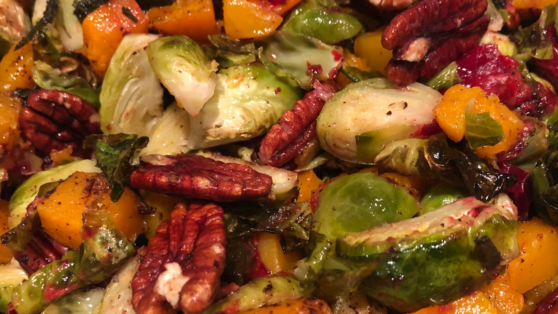 When vegetables are cooked through, toss in a large bowl: Roasted Brussels sprouts, butternut squash, cranberries, toasted pecans, and brown butter. Adjust seasoning as needed.
