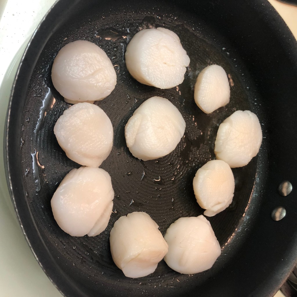 When the oil is very hot and just about to smoke, place the salted scallops in the pan.