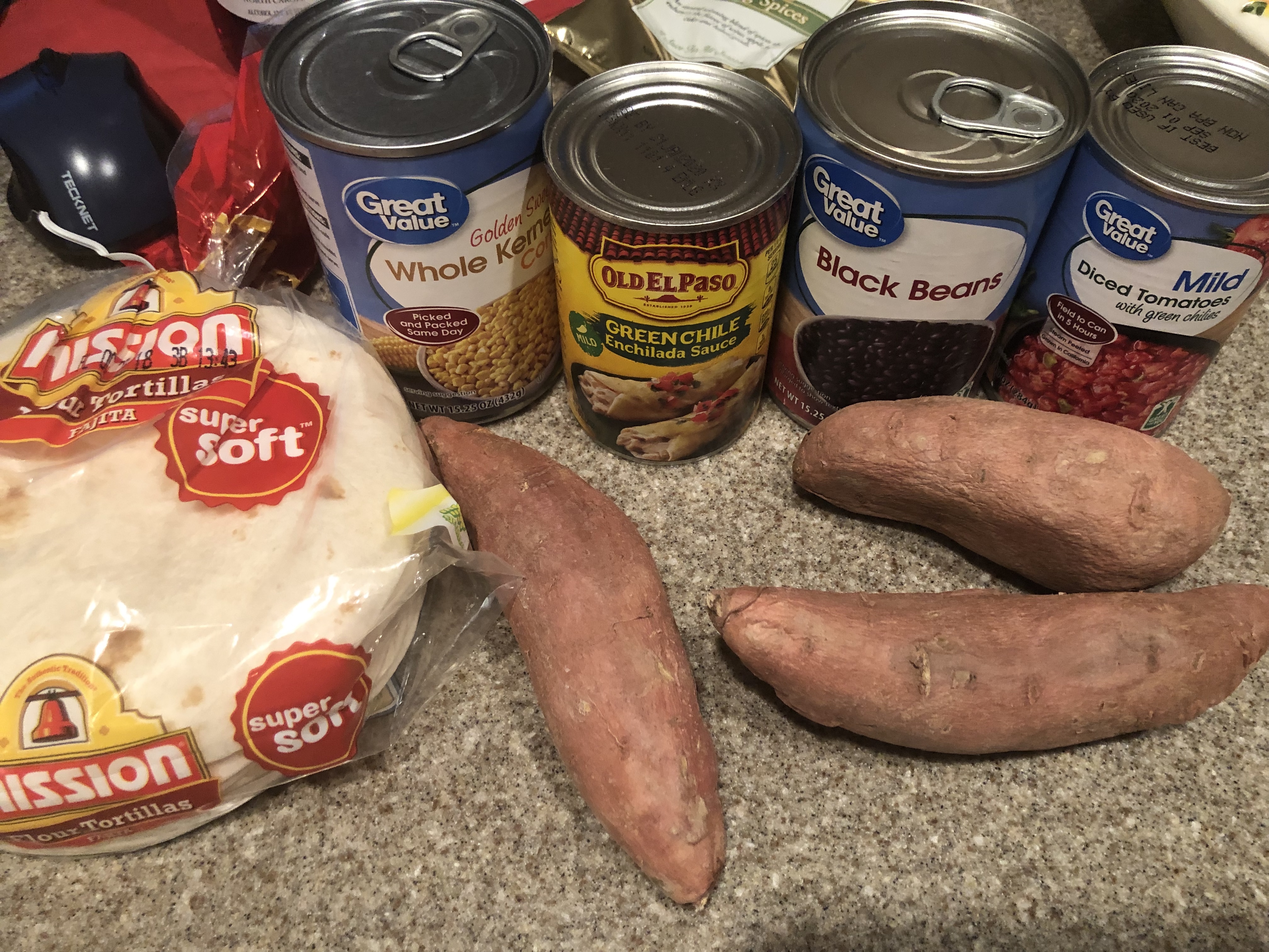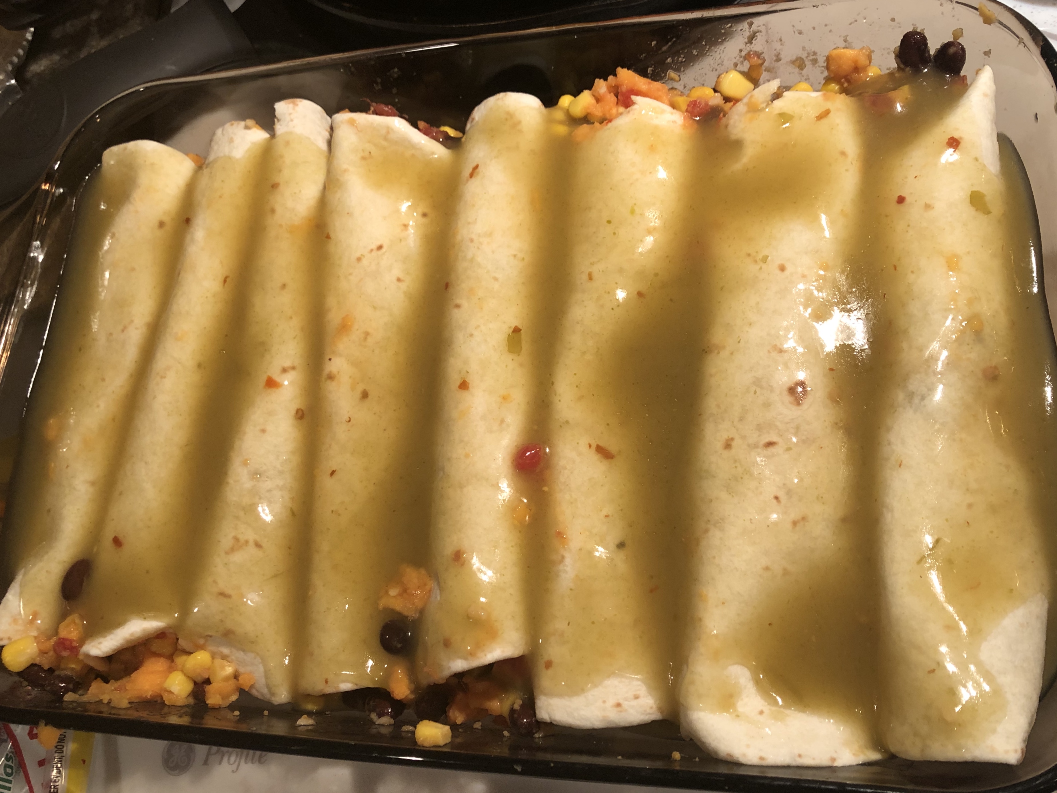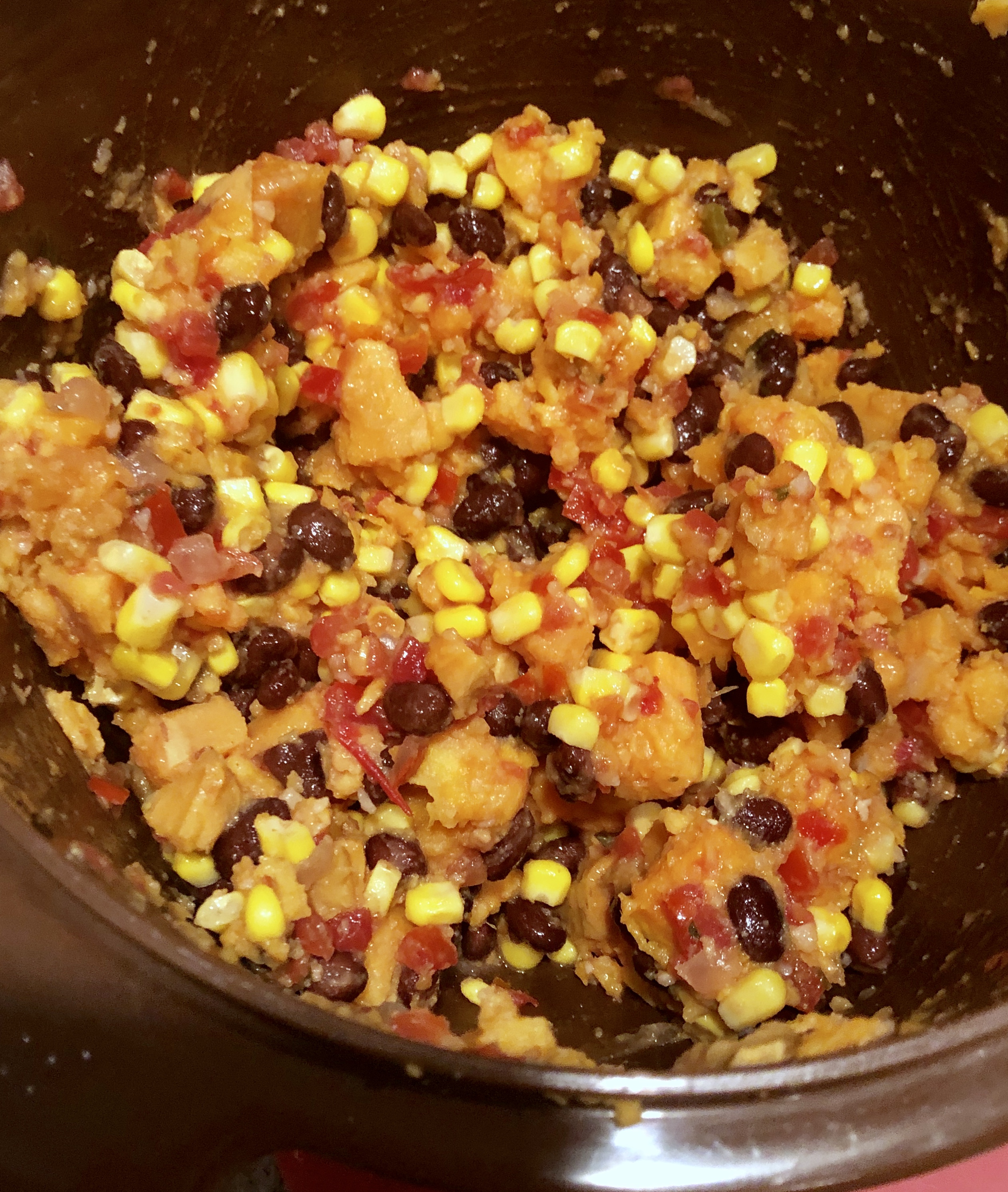 One a time, take a warmed tortilla, and fill with the black bean, sweet potato, and corn mixture (approximately 1/2 cup per tortilla, depending on the size.)