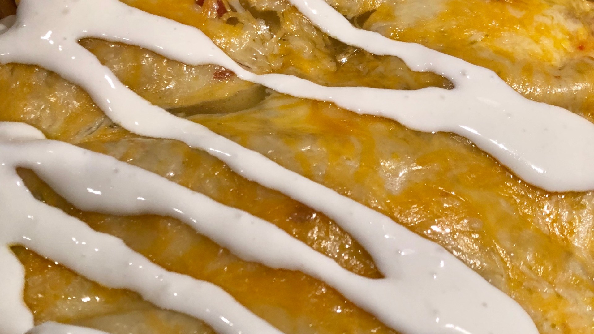 Wrap and roll the tortilla to the end of the baking dish. Repeat for the remaining tortillas. Top with the rest of the sauce. Top with a sprinkle of shredded cheese.