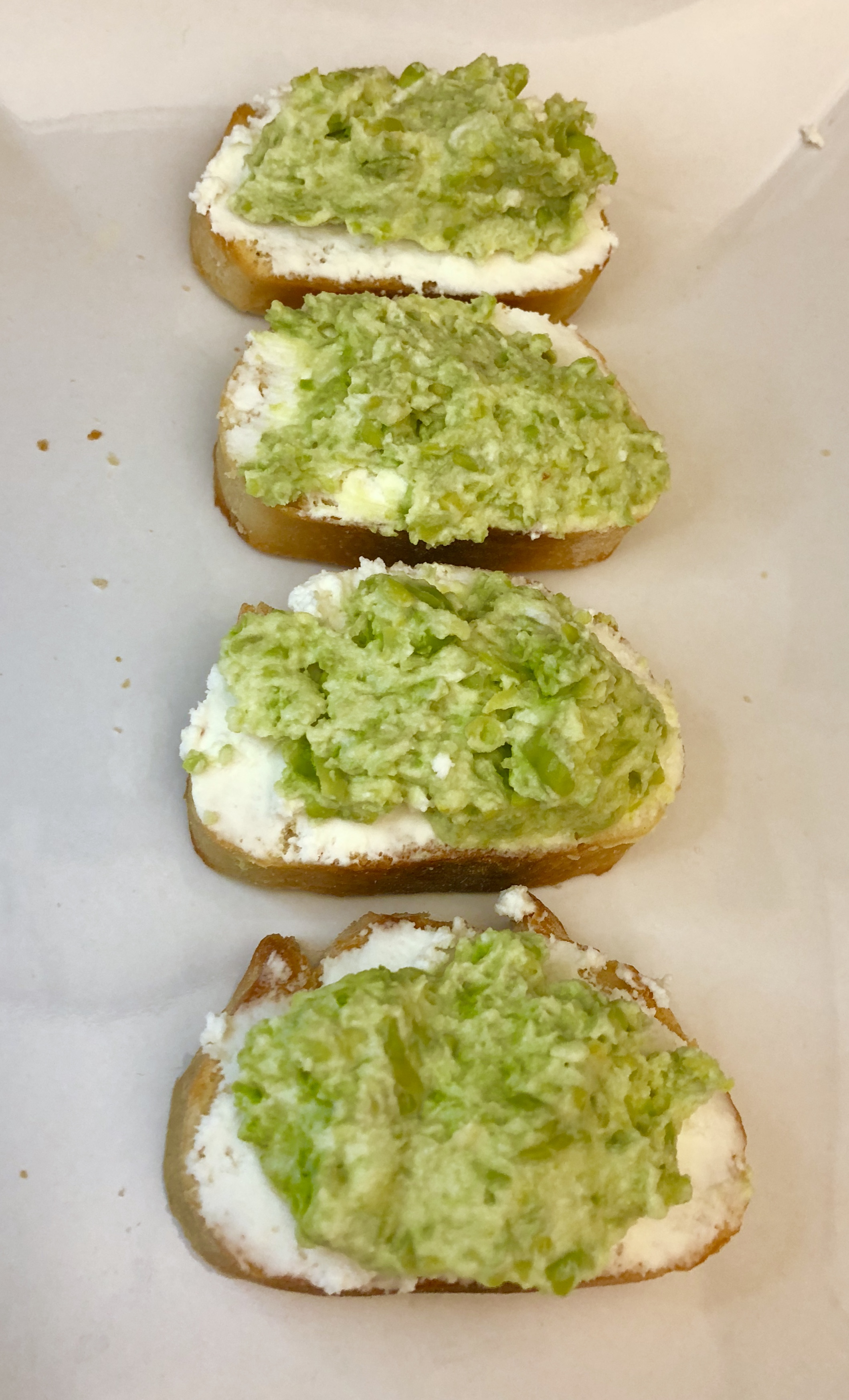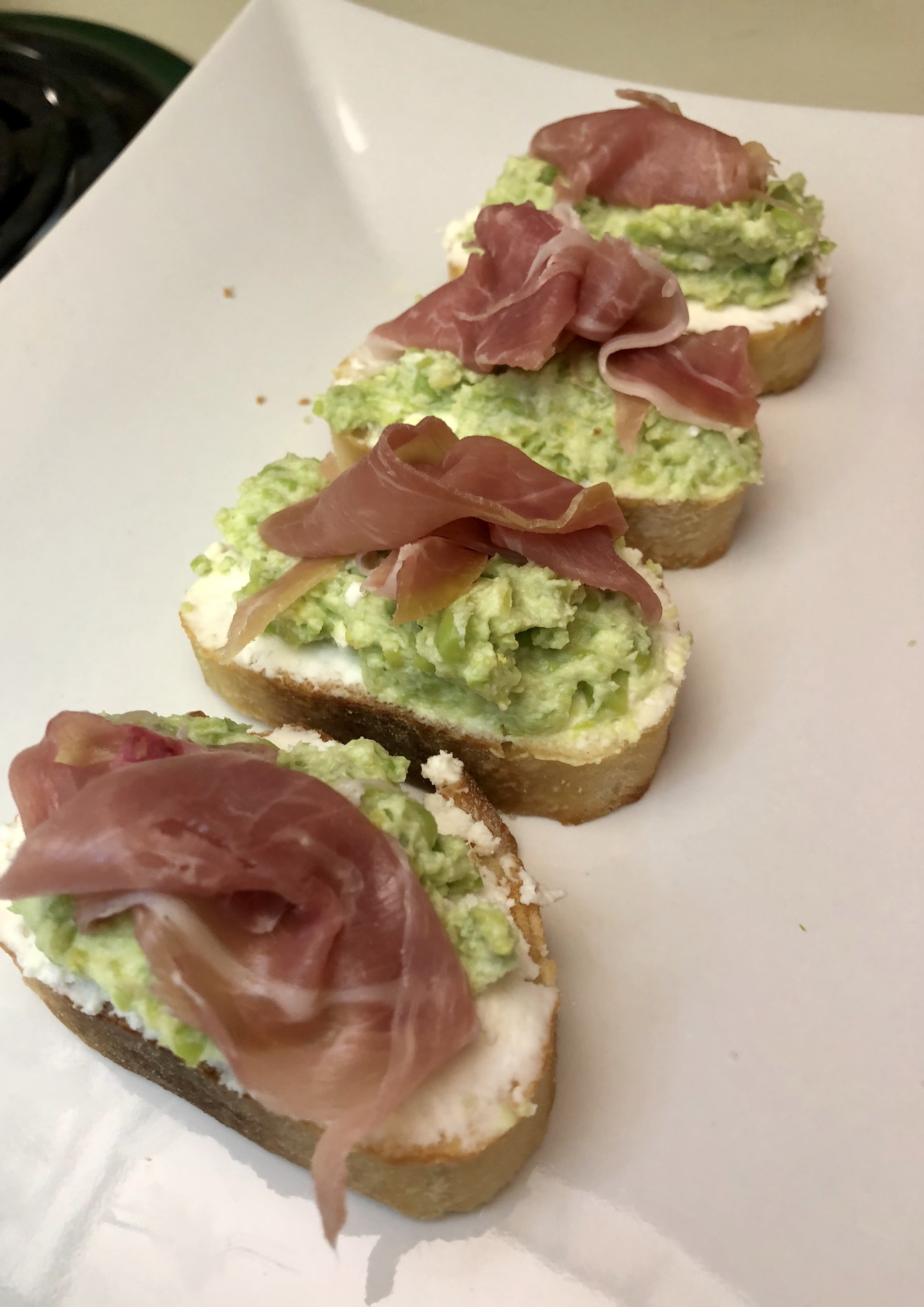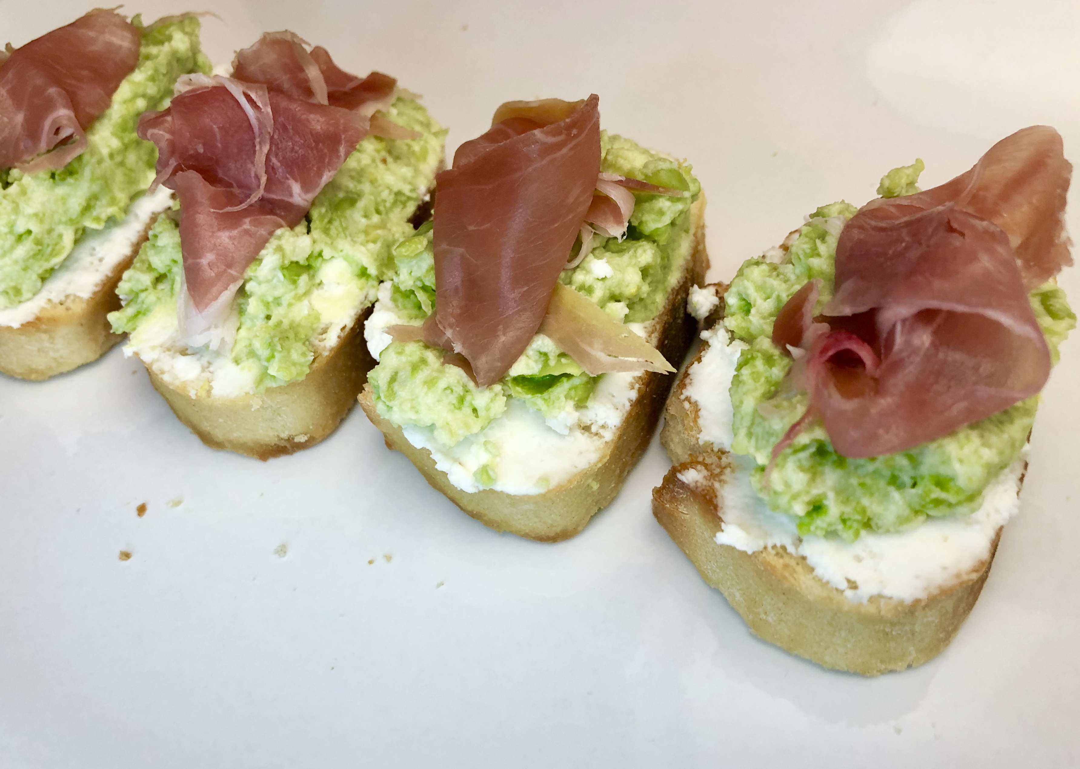 On each crostini, layer ricotta, pea mixture and prosciutto. (optional: drizzle extra-virgin olive oil on top before adding the prosciutto.)