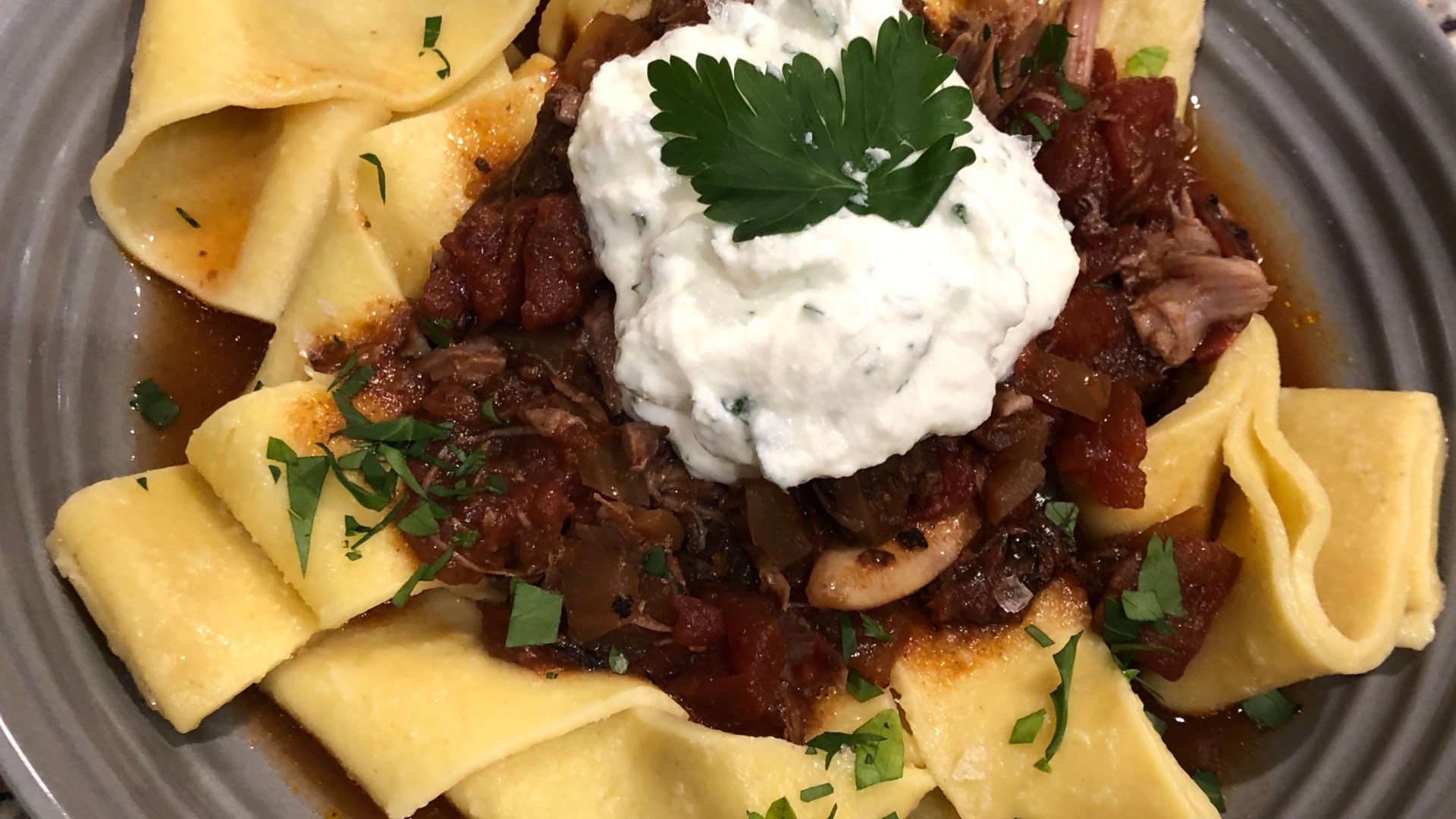 In a pasta bowl, add pasta. Top with sauce, and a dollop of whipped ricotta. Serve warm with a delicious glass of red wine.