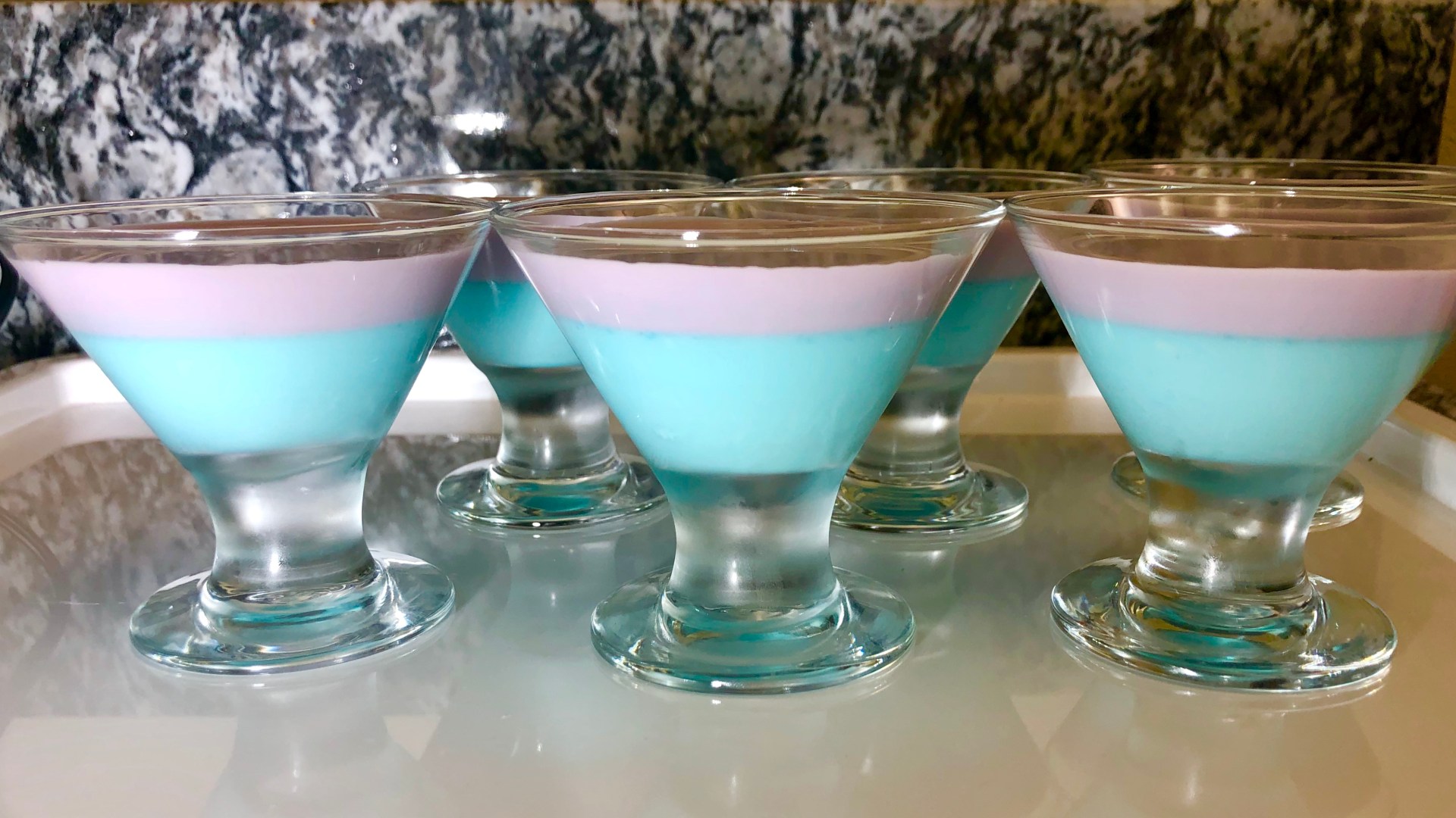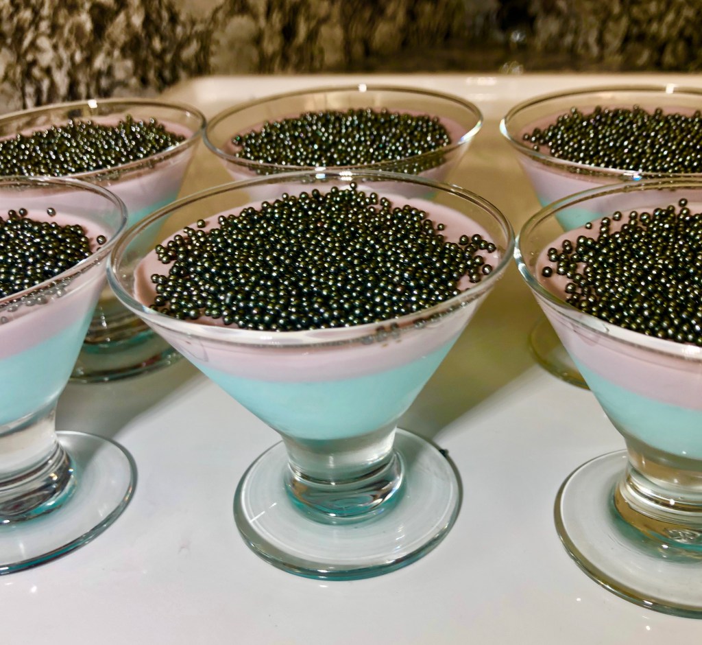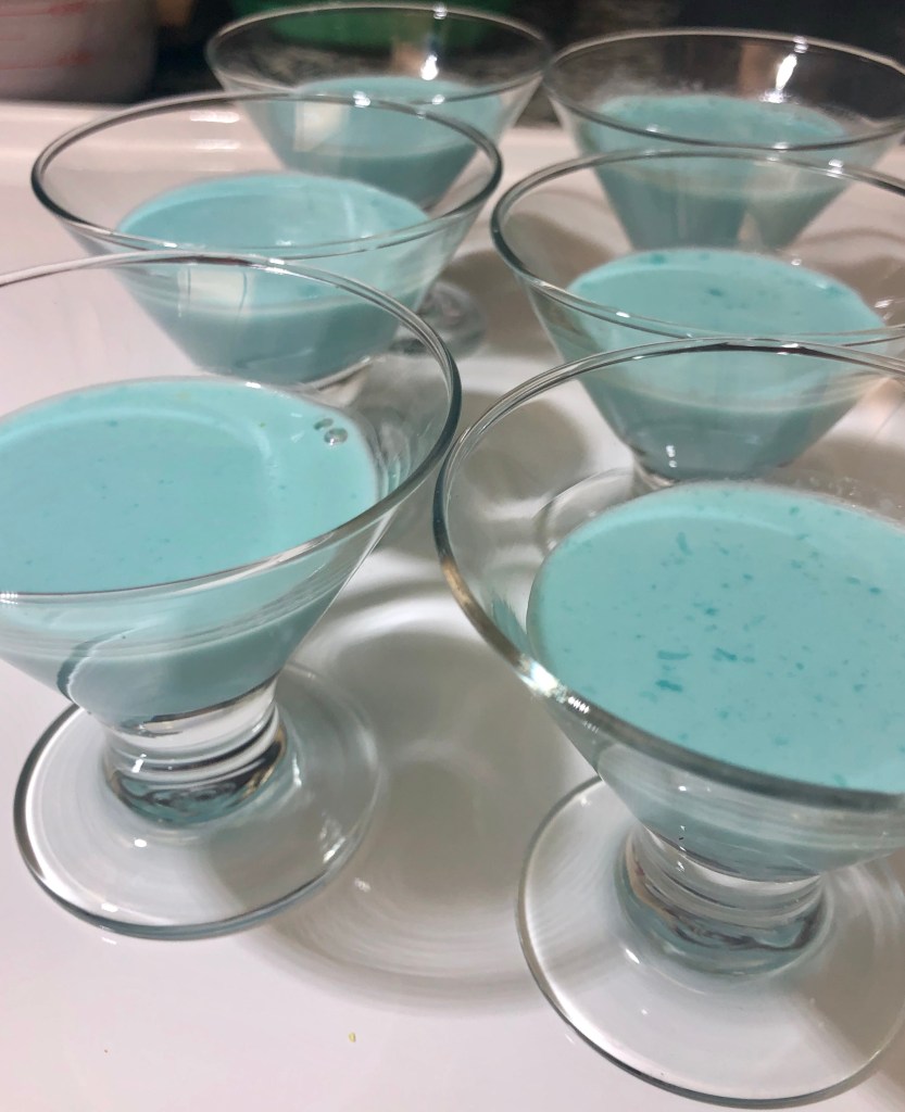Divide cream mixture among ramekins of your choice and cool to room temperature. (For this particular recipe, I layered the blue and the purple, but chilling the blue in the fridge until it started to solidified and poured the next layer.) You’ll need to add the nonpareils when it’s partially set, so they don’t sink in, nor just sit on top.) Chill ramekins, covered, at least 4 hours or overnight.