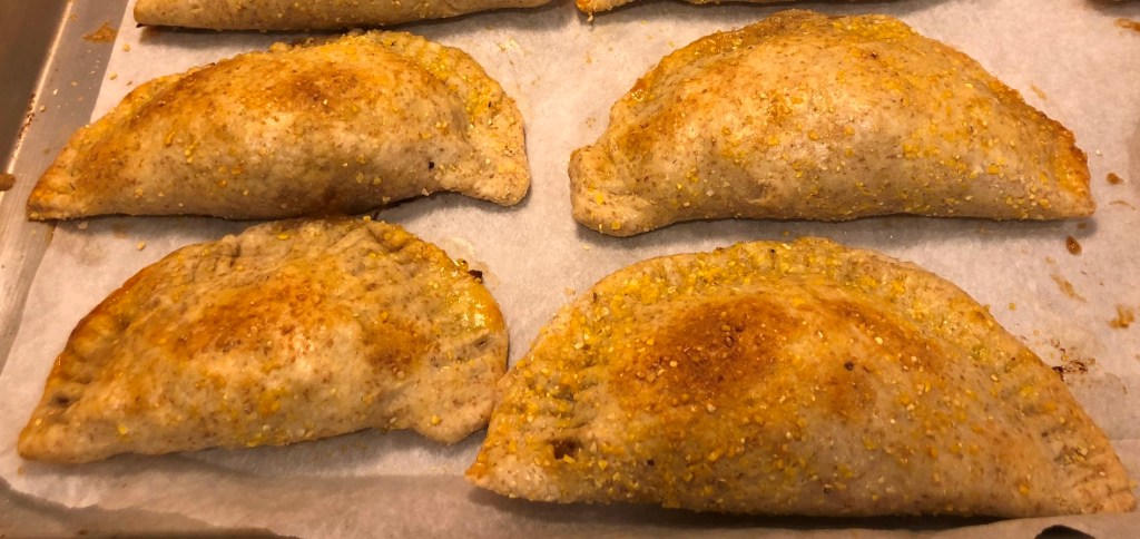 Dust a clean counter top lightly with flour (or we used cornmeal on the ones we didn’t put it into the dough on.) Unwrap the dough and divide into 12 equal pieces. Roll each into a ball with your hands, then a rolling pin to make into a thin circle (about 6 inches wide.) Place 1/12 of the filling on one half of the circle. Sprinkle with cheese. Fold over the side to form a half moon. Pinch the edges, or use a fork to make tight. Repeat until you’ve made 12 half moons.
