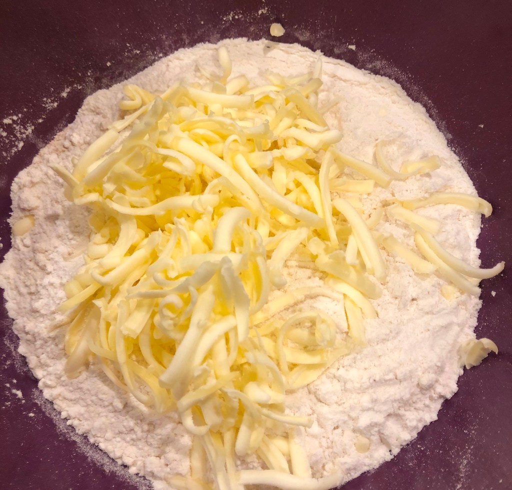 Make the dough; Place the butter in the freezer for 10 minutes. In the meanwhile, mix the flour, cornmeal, and salt in a large bowl. Grate the cold butter (or use the food processor), into the flour mixture. With your hands, kneed the butter gently into the flour.