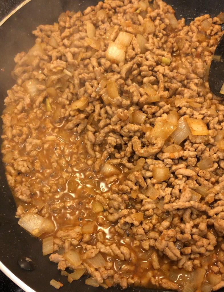 Make the filling: Saute onion and ground pork, breaking it up. (season with salt and pepper.) Add in seasoned tomatoes. Simmer until reduced and thick.