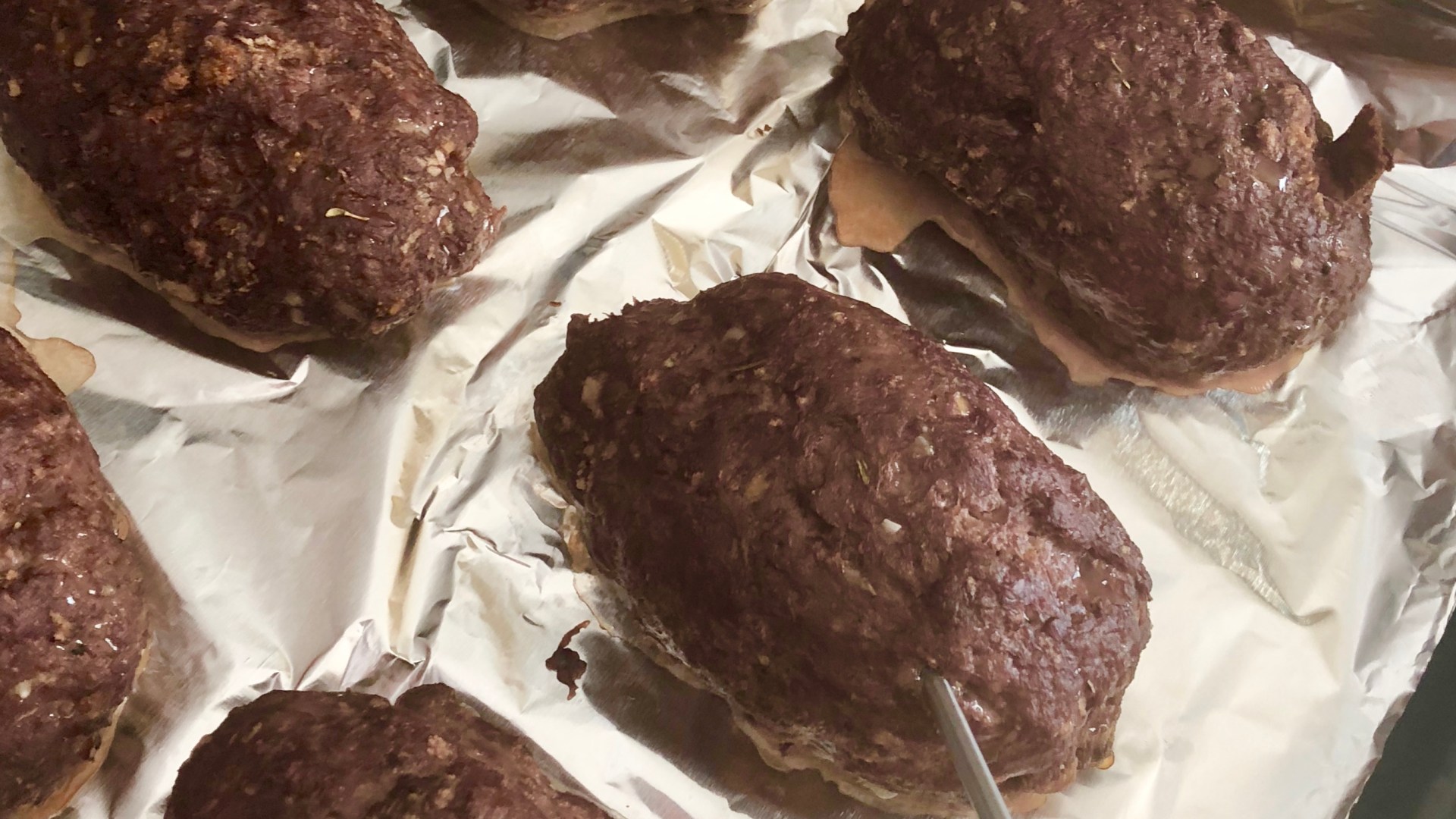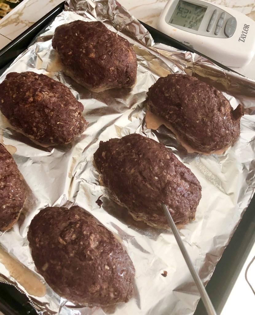 Bake loaves uncovered at 350 degrees in oven for 25-30 minutes or until meat thermometer reads 160 degrees.