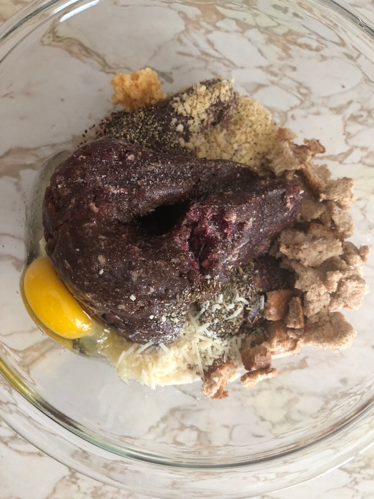 - 1/2 cup plain (or Italian) bread crumbs, or torn bread (or a combo, which is what we did as we try to use what’s in the house!)