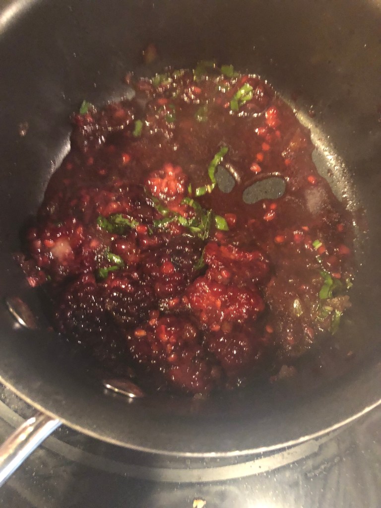 Add jalapenos into sauce pan, and allow to slightly cook (about 3-5 minutes). Add blackberries, 1/2 the basil, and water. Allow to simmer about 10 minutes until the blackberries have broken down to the desired consistency. Allow to cool slightly.