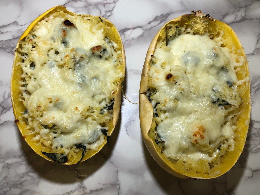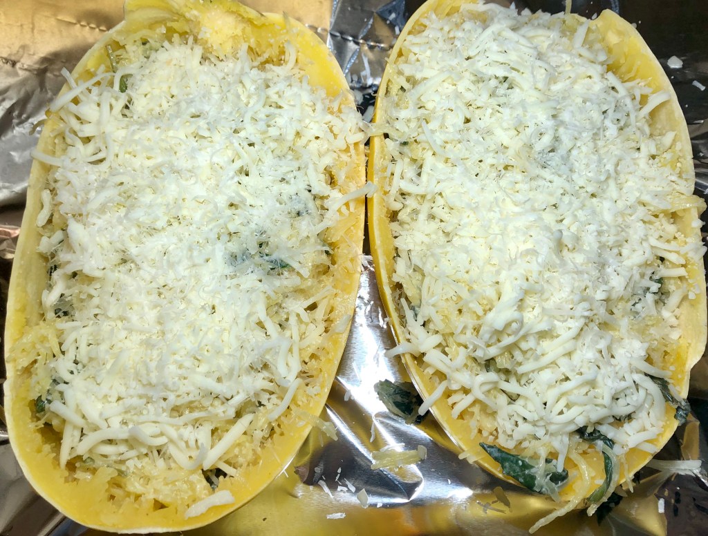 Pour your sauce over each squash boat, stir to mix, and top with a little mozzarella cheese and additional parm cheese.