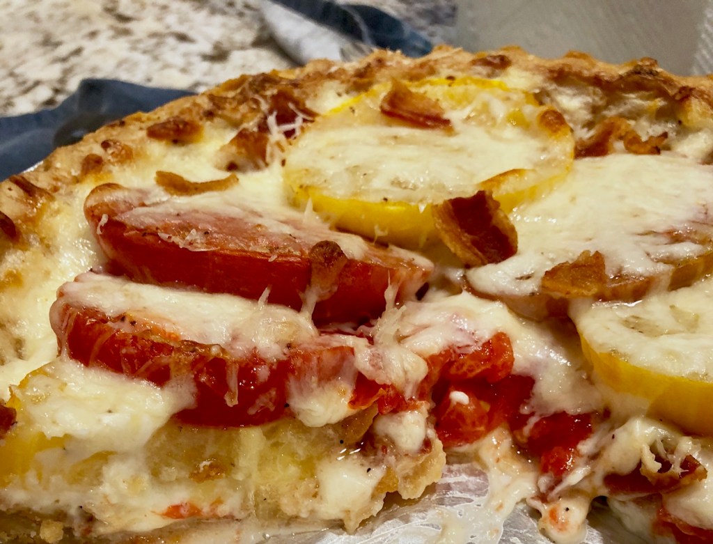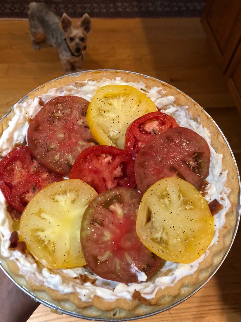 Mix cooked, chopped bacon with the mayo. Spread an even layer of the tomato slices over the pie. Season with freshly ground pepper.