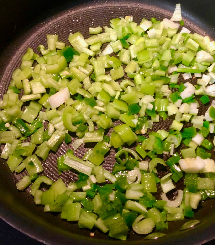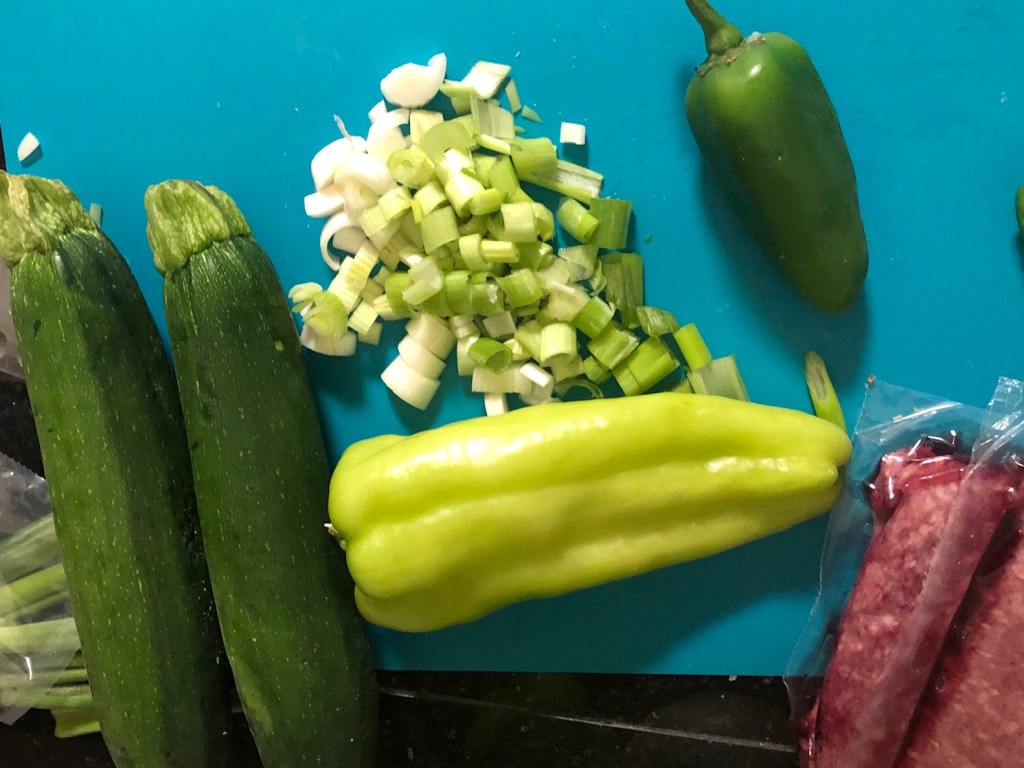 While your potatoes are boiling, in a saute pan, heat oil. Add minced peppers, whites of the green onions, and zucchini. Cook for about 3-5 minutes until started to turn soft.