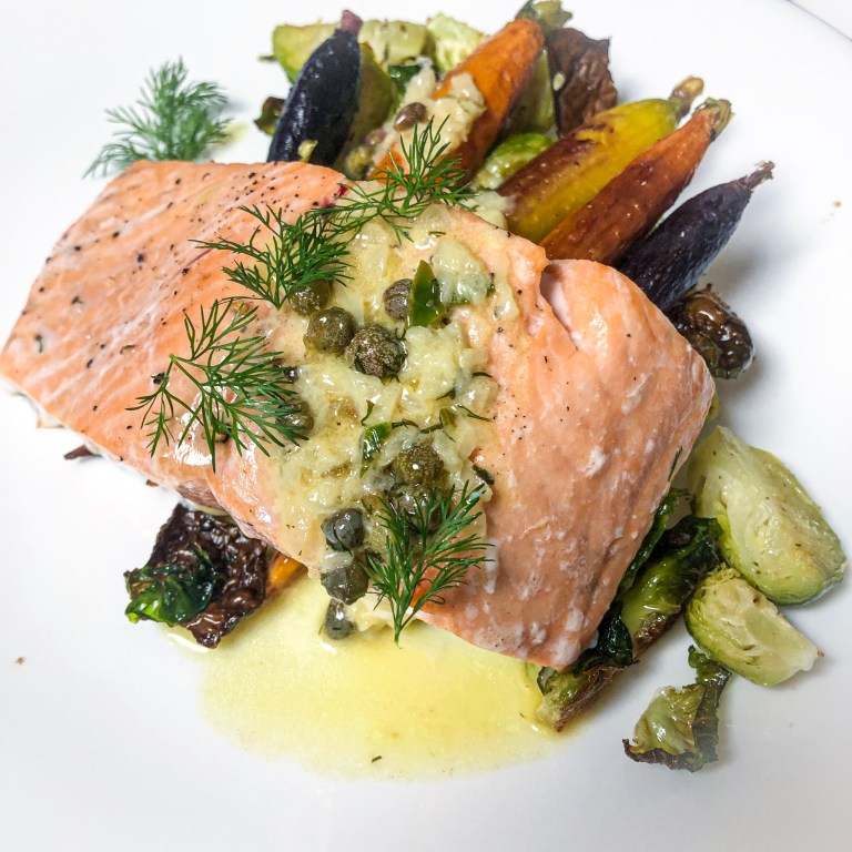 While sheet pan is roasting, whisk lemon juice, onion/shallot, mustard and capers with remaining ¼ cup oil and ¼ teaspoon salt and drizzle over salmon and vegetables. Serve Warm.