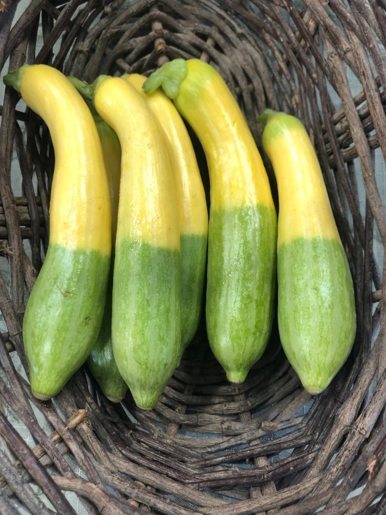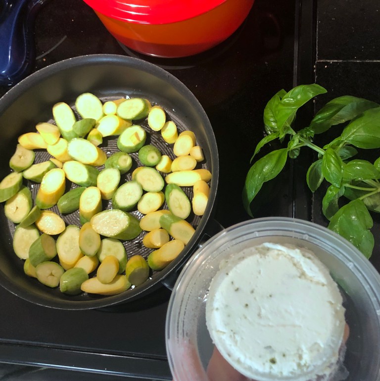 This is my favorite kind of dish: where you walk around the Farmer’s Market, and based on what you find, get inspired to make a recipe! This zucchini was so fun looking because of its dual colors, and when I found my favorite brand ever, UAV cheese, I knew I had something. Although I am obsessed with their ricotta cheese, I was pleasantly surprised by their goat cheese. I tried the basil and lemon, pictures the fresh basil in the garden, and knew it had to be.
