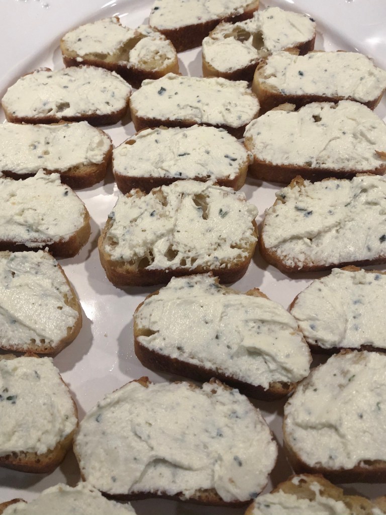 Slice baguette into 1/2 inch slice. Brush both sides with olive oil, season lightly with salt and place on a foil lined baking sheet. Bake at 350 degrees for 20 minutes, flipping halfway and adding more oil and salt. (I sometimes cheat and use the spray olive oil.) Cool.