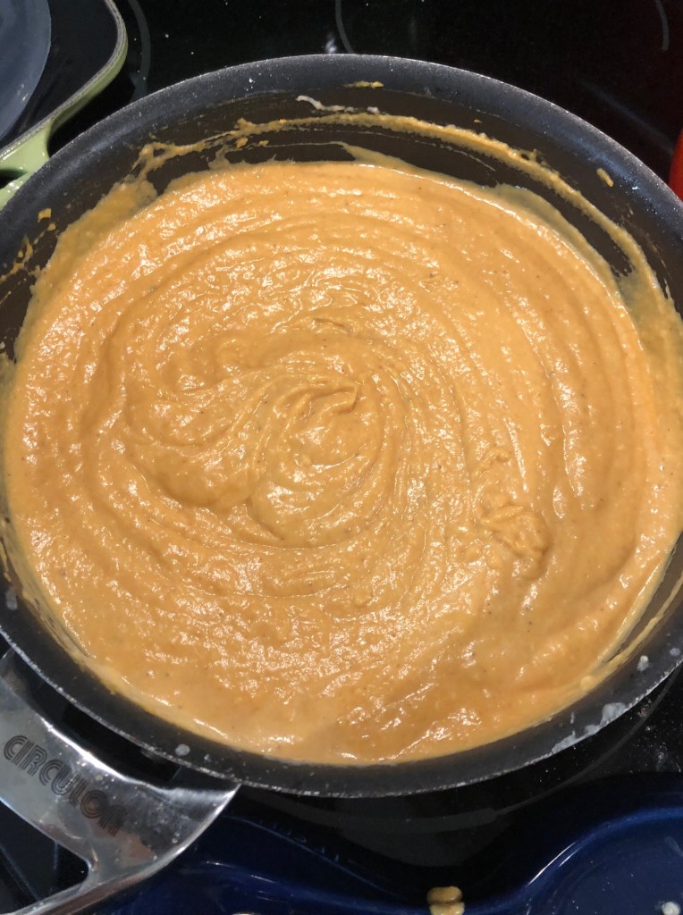 Bring the mixture to a simmer. Let thicken. Add the salt, pepper, nutmeg and the pumpkin, whisk to combine. (Add milk to Bechamel if too ‘tight.’)