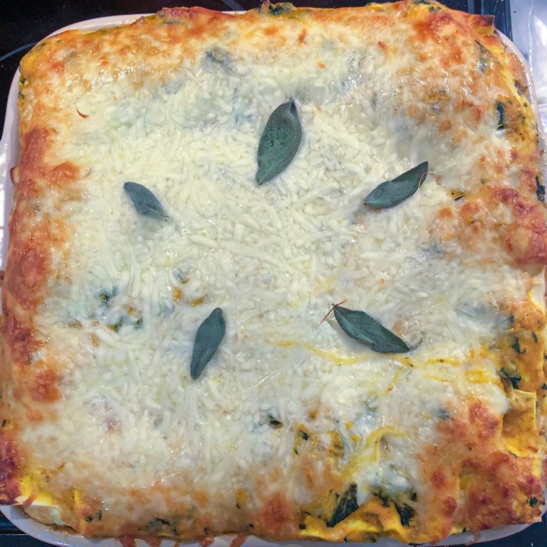 Cover with foil and bake for 20 minutes, then remove the foil and continue baking for an additional 20 minutes or until the top begins to turn golden brown. Remove and allow to sit for 15 minutes before cutting and serving. Garnish with fresh sage (optional.)