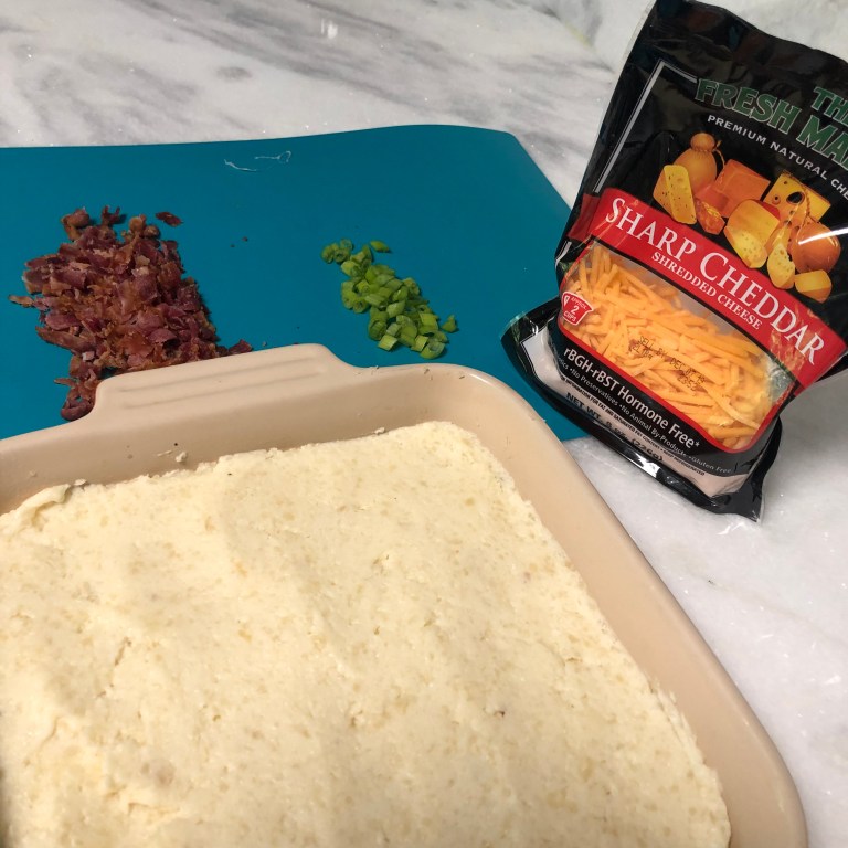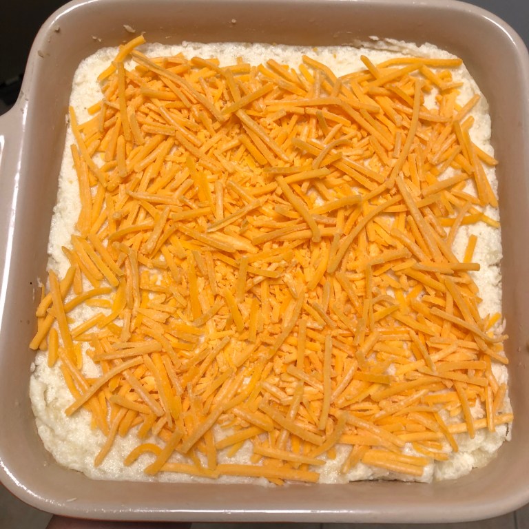 Layer potato mixture into a baking dish. Top with shredded cheddar cheese & crumbled bacon.
