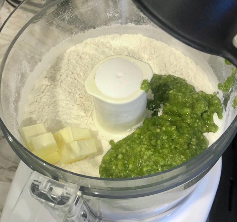 Pulse 2 cups flour, baking powder, baking soda, and salt in the food processor once or twice to blend. Add butter and pest and pulse until the mixture is a coarse crumble. Add the buttermilk and pulse until the dough holds together.