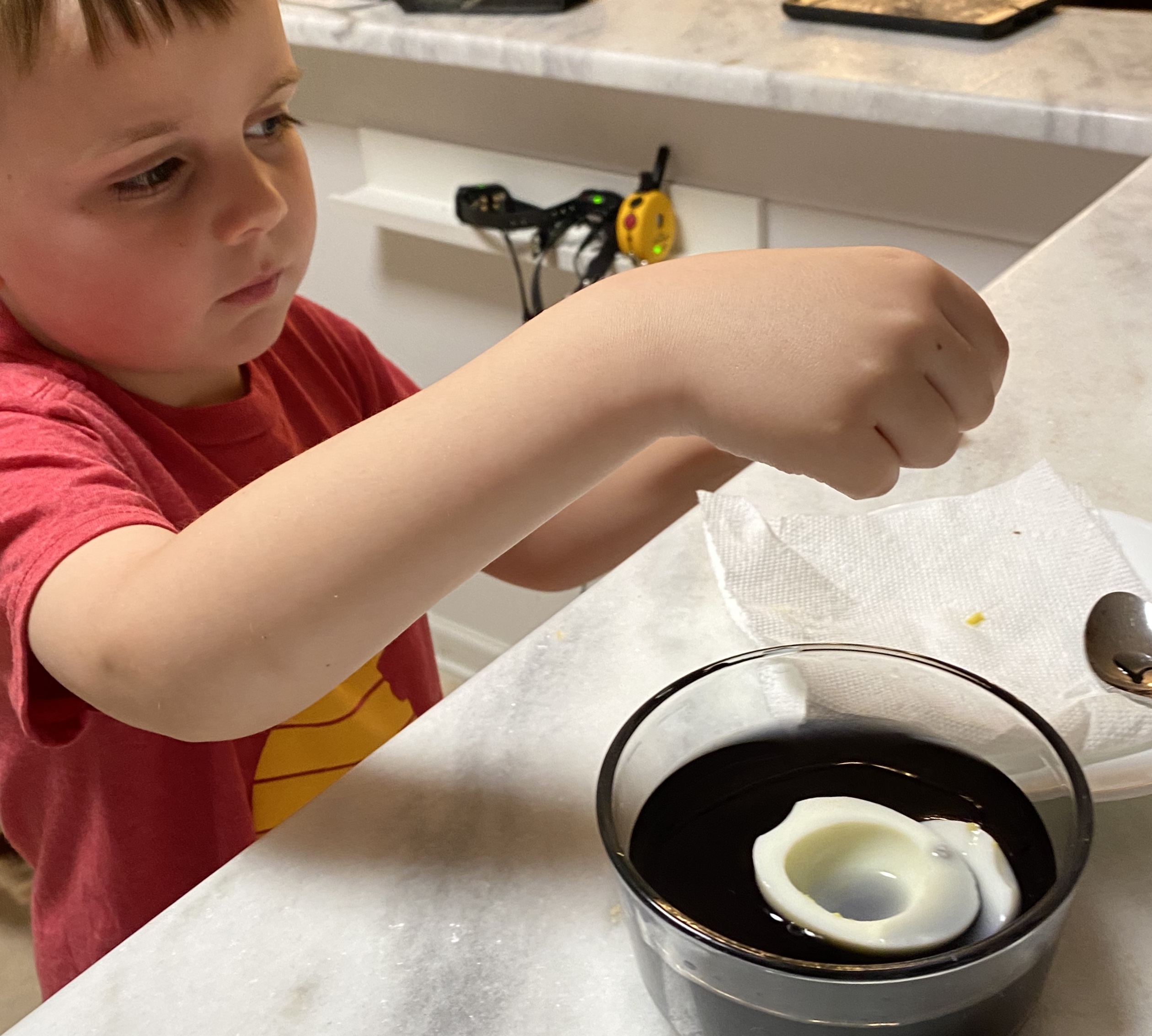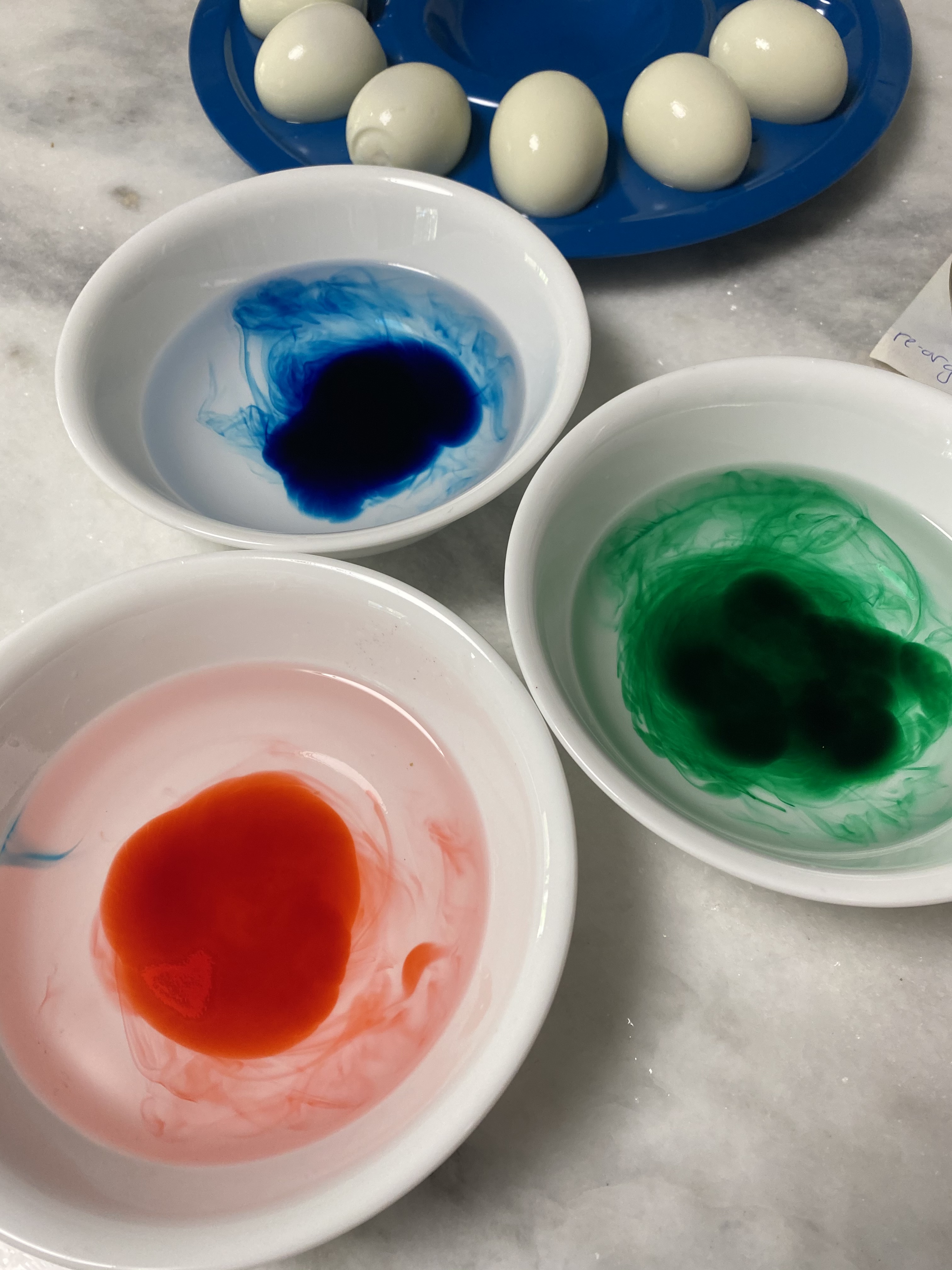 Steep the egg white halves in each bowl, about 5 minutes, depending on how dark you want the color.