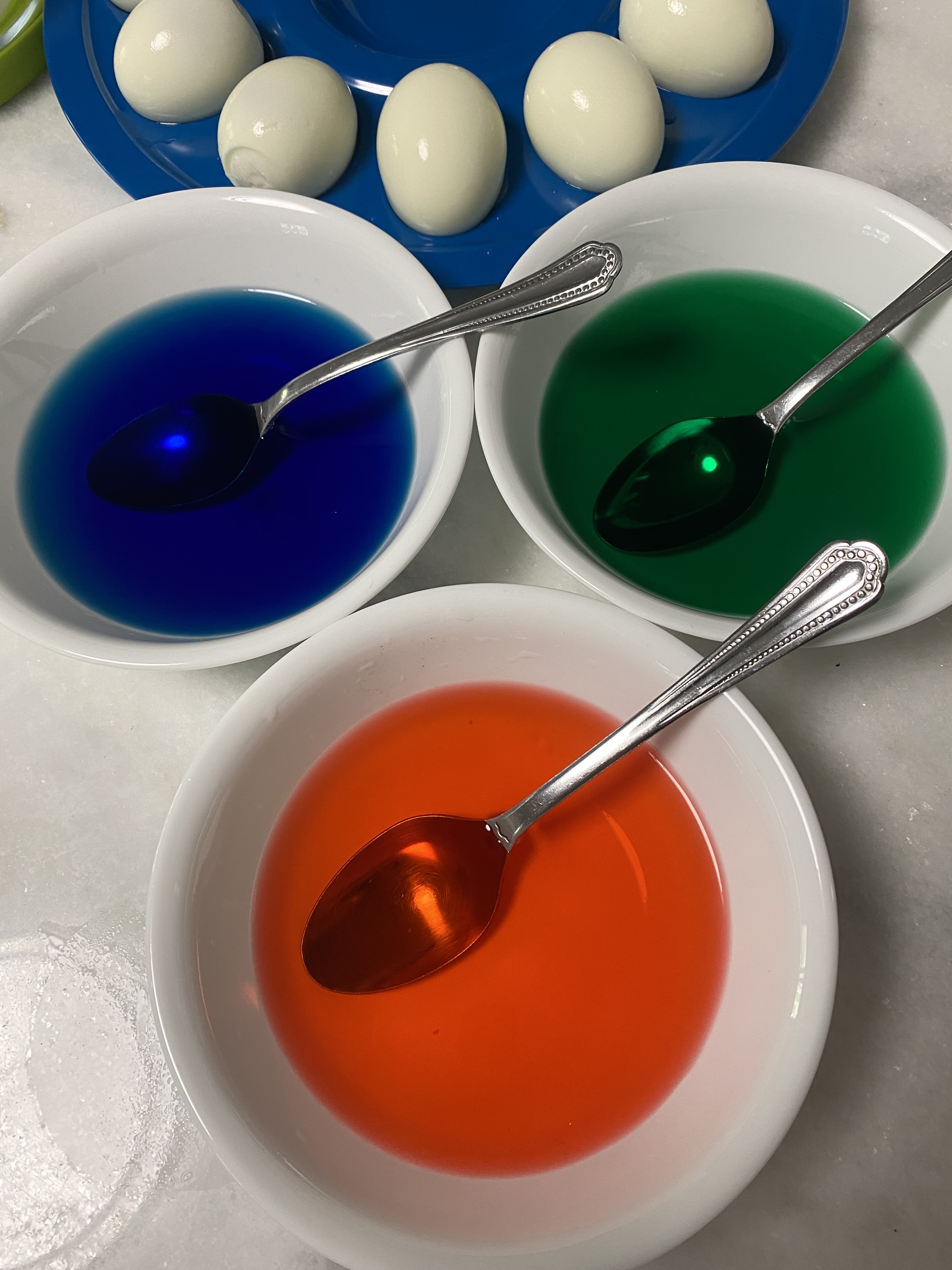 In different bowls, add about 1.5 cups of water and 4-8 drops of food coloring. (It depends on the color. Red needed more than blue or green.)