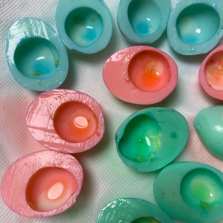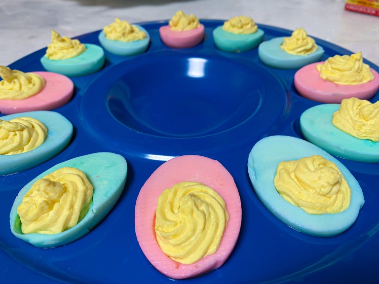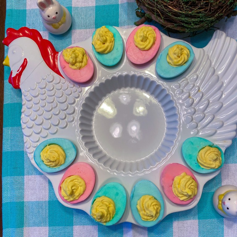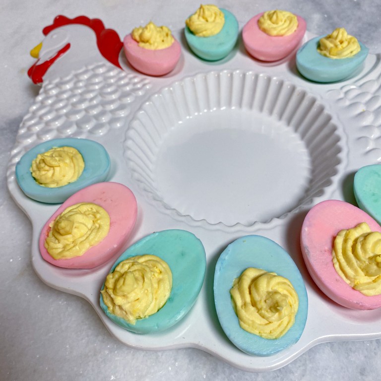 These deviled eggs can be made with any filling recipe, but this helps explain how to dye the egg white to make the more festive! It is super simple and only takes 5 extra minutes from your original recipe.