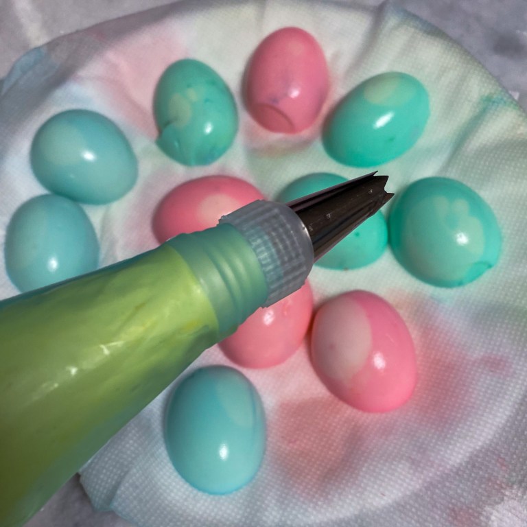 Pipe or spoon egg yolk filling into colored egg white halves.