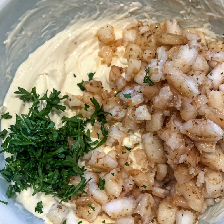 Take most of the chopped shrimp & parsley and fold into mixture. (Reserve a few to plate on top.)