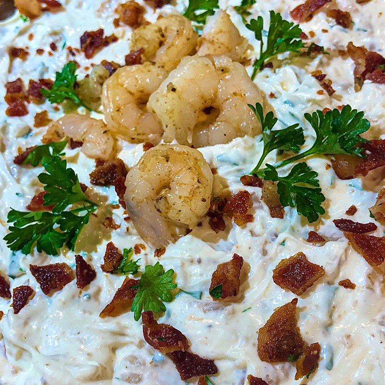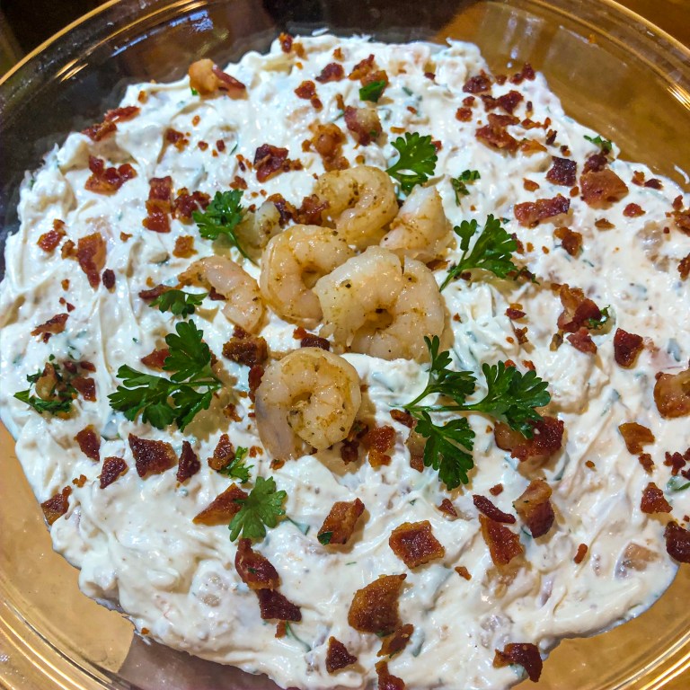 Are you like me and think that shrimp has to be the best protein ever? It has to be the best for everything from dips to tacos to quesadillas to salads! So I knew I wanted it for my dad’s surprise 80th bday party! (Plus, I had minimal time to prepare and to cook, and again, shrimp is the fastest and easiest.) Granted, I only knew about half the guests very well, but the said they loved the shrimp dip… and sadly, none came home with us! haha.