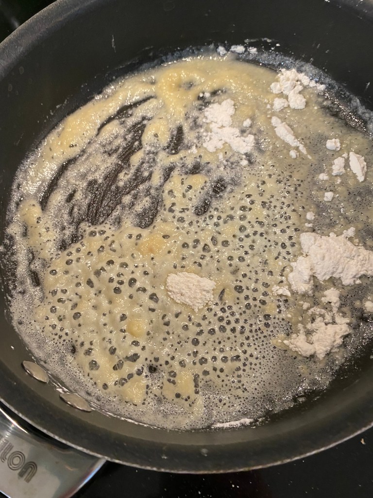 Make the cream sauce: melt 3 tablespoons butter in a medium-sized sauce pan over medium heat. Add flour and stir for 2 minutes, until lightly cooked through.