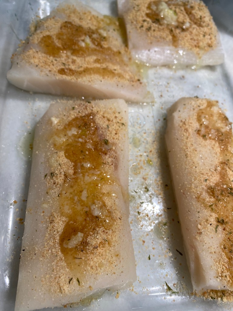 When picking what fish to use, it can be any mild white fish, not just cod. Halibut, tilapia, mahi mahi… Since I was trying to use what I had in the freezer, I used two different kids. Just check for doneness.