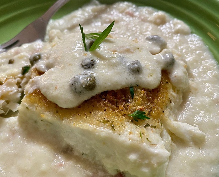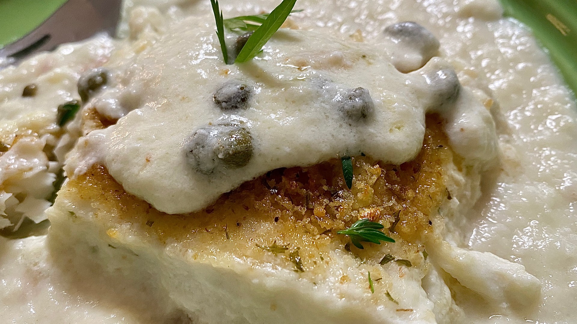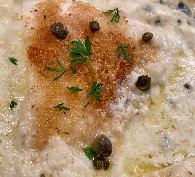 Slowly whisk in half and half. Simmer on low for about 10 minutes until thick and cream. Stir in Parmesan cheese, lemon, and capers. (think of it like a gravy.) Adjust seasoning.