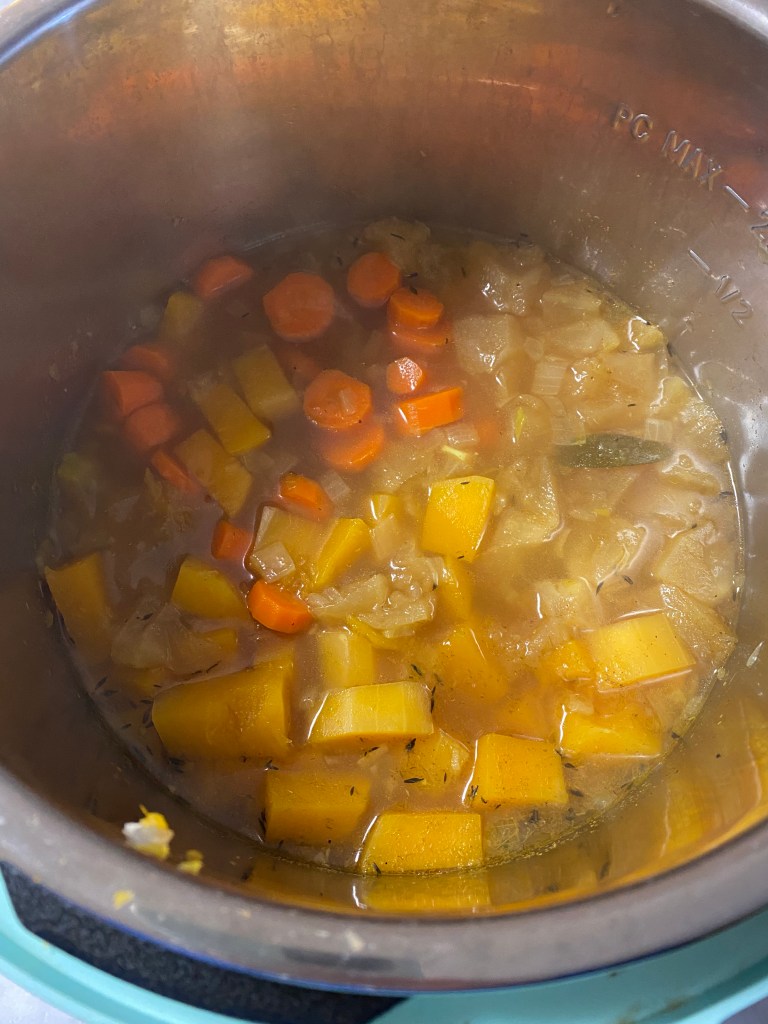 Healthy, light, and easy recipe? We are in for that! This dish was made to lighten up a Sunday dinner with a friend. I was able to throw most things into the Instant pot, then socialize (with a crispy, white wine.) The only real effort at the end is pureeing the soup and serving it up.