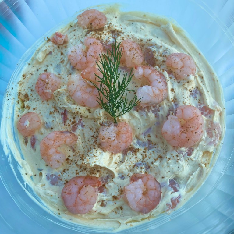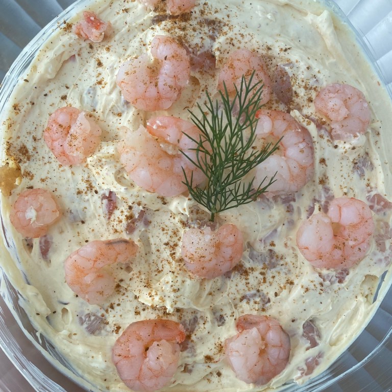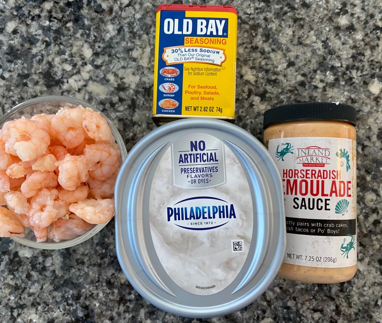 In a mixing bowl, combine shrimp, cream cheese, remoulade, and old bay. Adjust amount of Remoulade or old bay to taste.