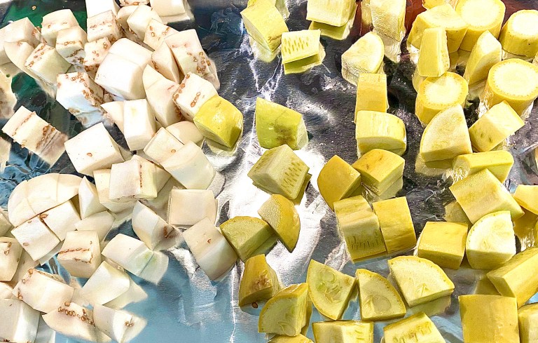 Our garden is popping and time to each some veggies! (Okay, I’m exaggerating a lot!! I have now grown one white eggplant, one cucumber, and luckily, my tomatoes are killing it. My mother in law has a giant garden so she donated zucchini and squash. –> But the white eggplant is from my garden! Also while I’m completely off topic, white eggplant is super cool. It’s also white on the inside and is a much more mild flavor compared to traditional purple globe eggplants, but with the same texture.)