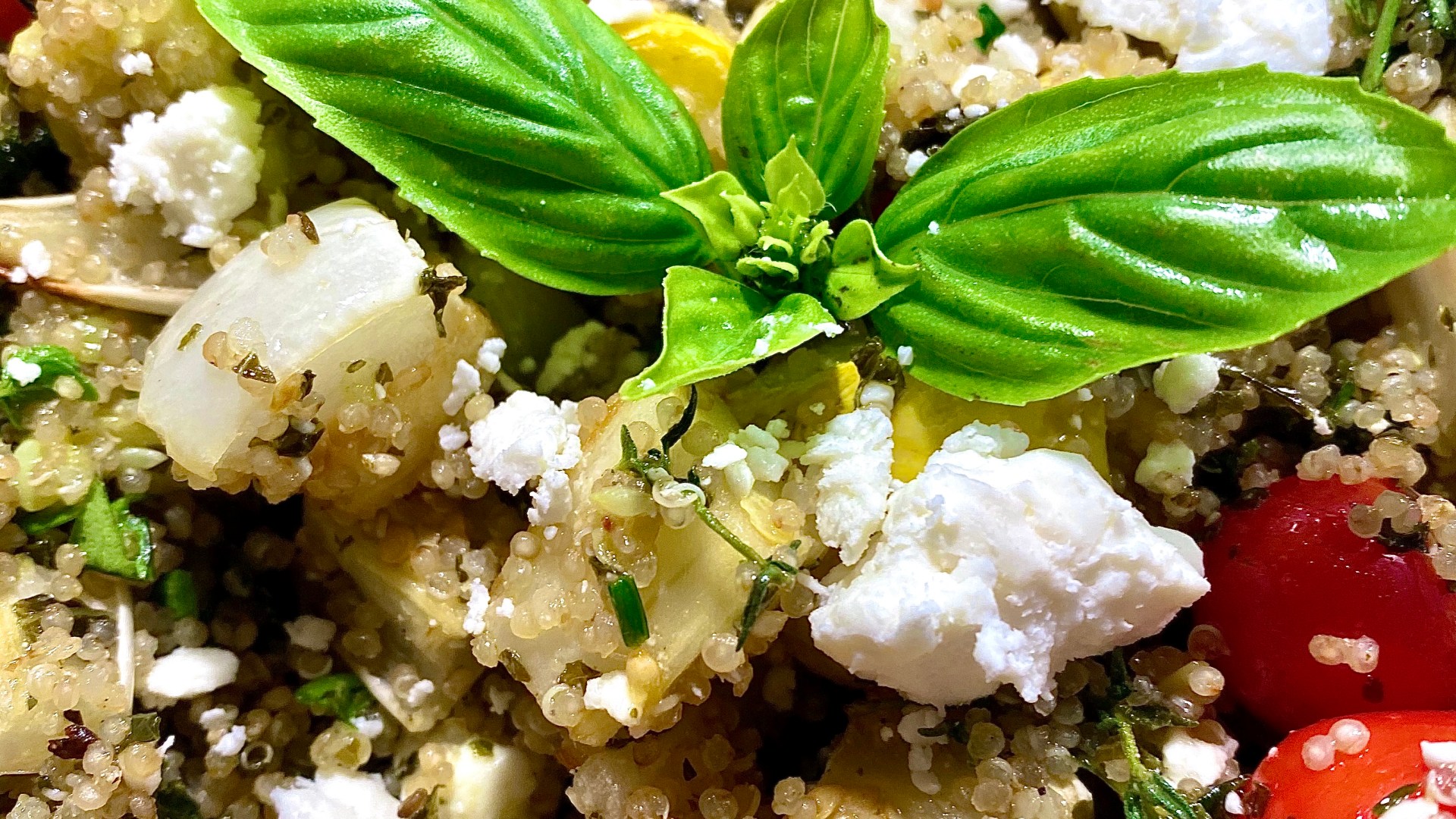 In a small bowl, whisk olive oil, lemon juice, and garlic. In a large bowl, toss quinoa, roasted vegetables, fresh vegetables (tomatoes), spinach, and dressing.