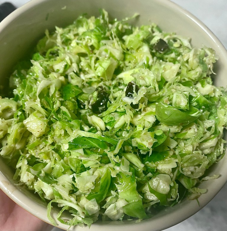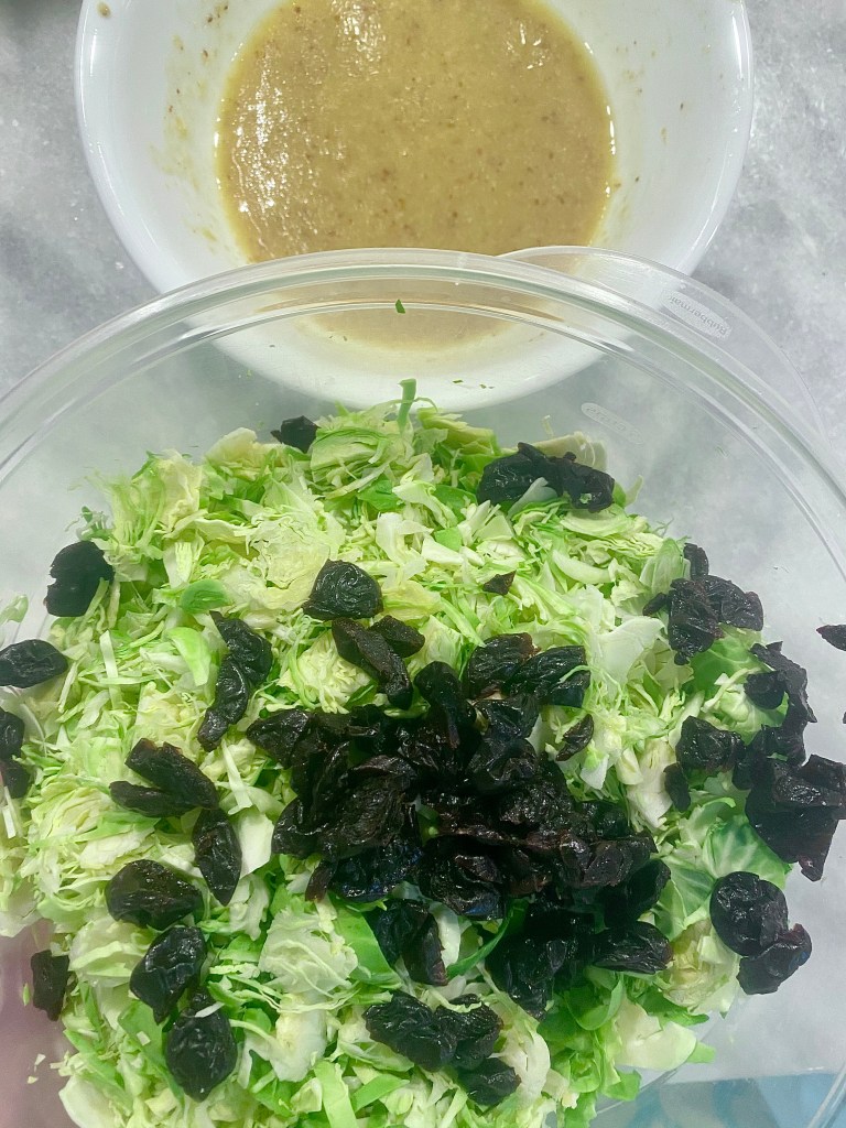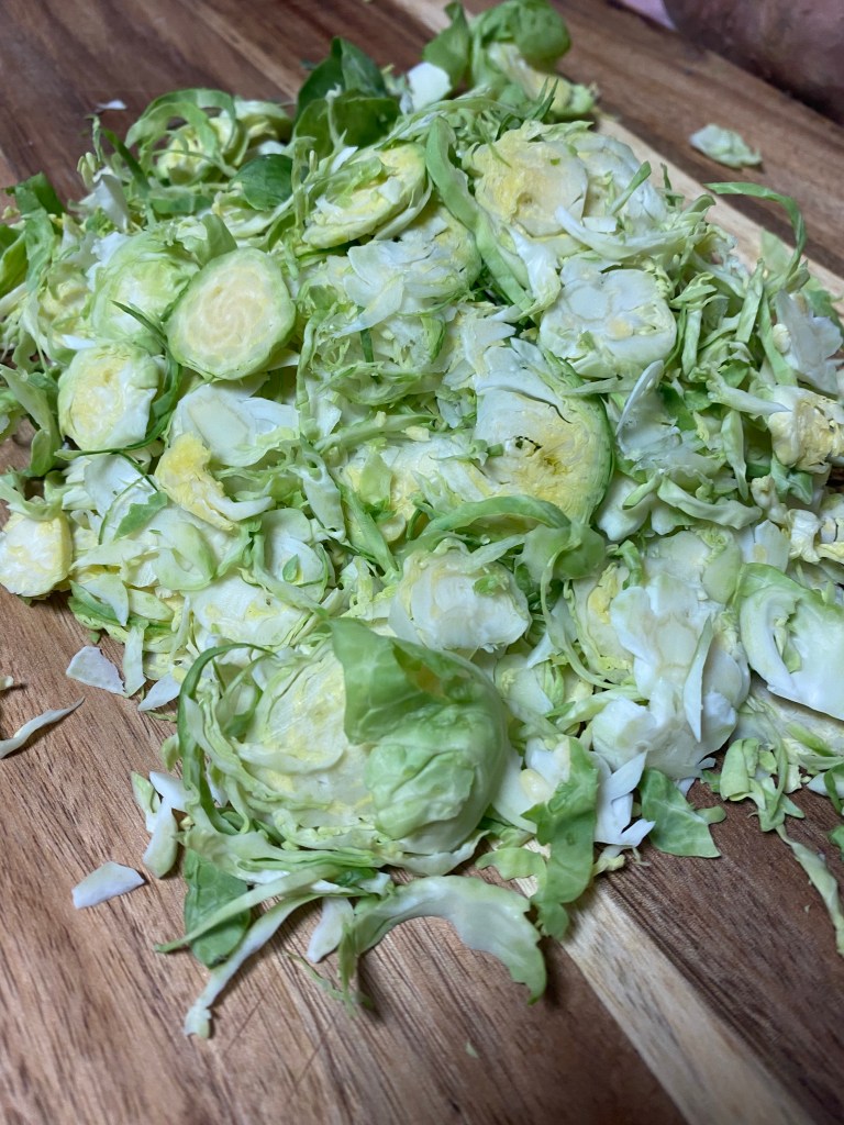First lesson I learned: Shaving Brussels sprouts is not that easy (so feel free to buy a bag pre chopped.) I tried the food processor slicer (didn’t really work), then food processor chopper (made it chunky). I tried the mandolin, which worked well, but time consuming. It also was best to slide it top to bottom instead of left to right. In the end, it was delicious, but wanted you to know the options on how to create the Brussels sprouts part of this salad.