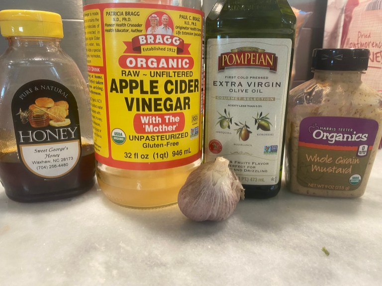 Whisk together vinegar, Dijon mustard, honey, and garlic. Gradually whisk in oil until blended.