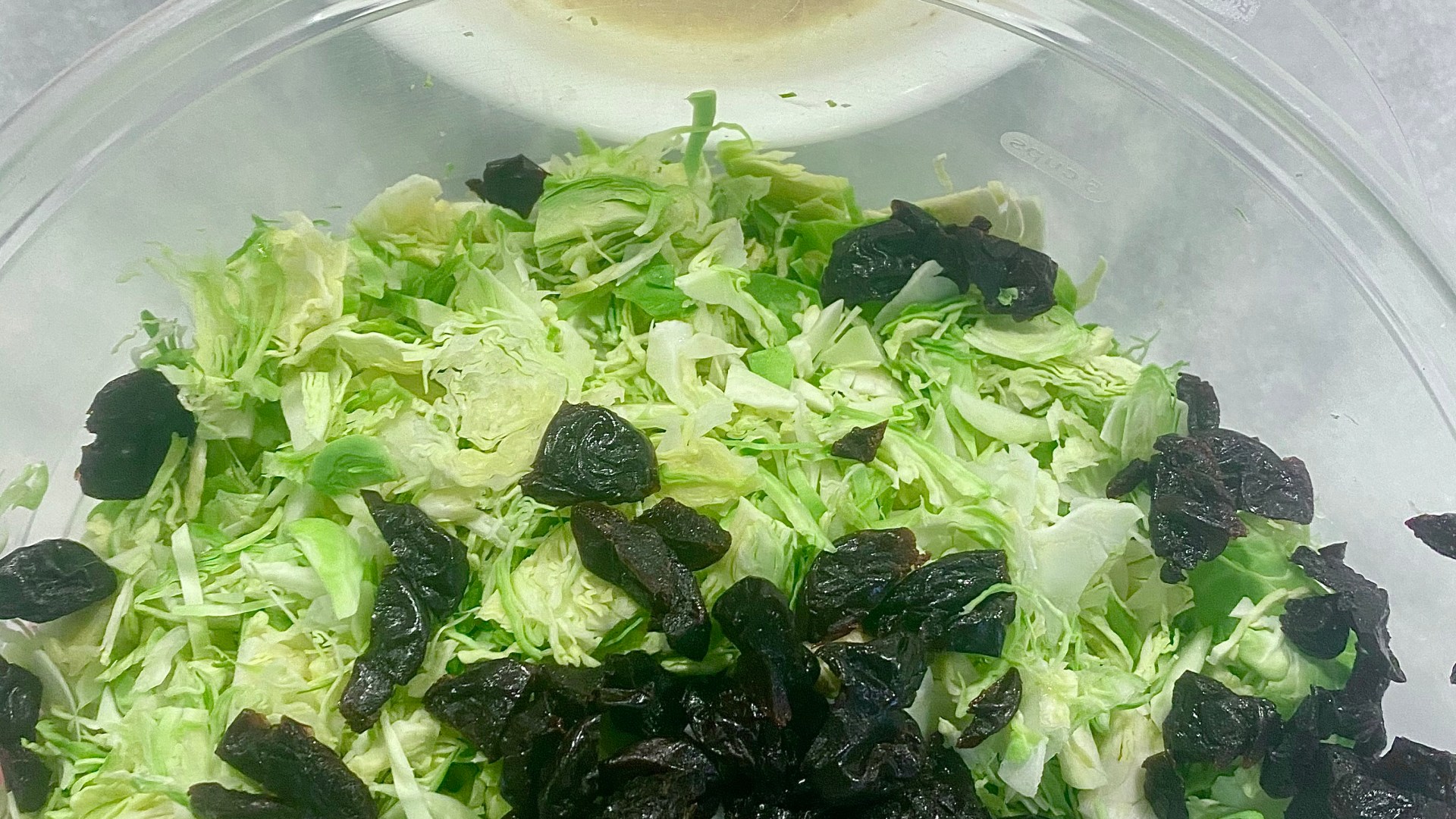 First lesson I learned: Shaving Brussels sprouts is not that easy (so feel free to buy a bag pre chopped.) I tried the food processor slicer (didn’t really work), then food processor chopper (made it chunky). I tried the mandolin, which worked well, but time consuming. It also was best to slide it top to bottom instead of left to right. In the end, it was delicious, but wanted you to know the options on how to create the Brussels sprouts part of this salad.