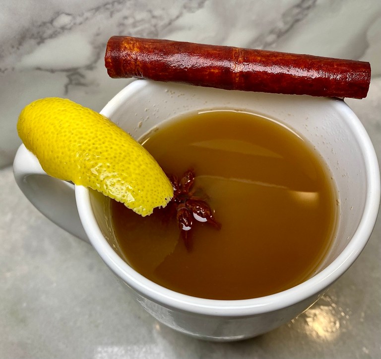 Both warm and strong, this cider has a strong apple flavor, but then has that bourbon and lemon. They say that alcohol kills germs, and with all the covid germs around, it’s an extra great occasion to drink up. (Okay, the killing germ part is debatable, but it does make you feel better!)