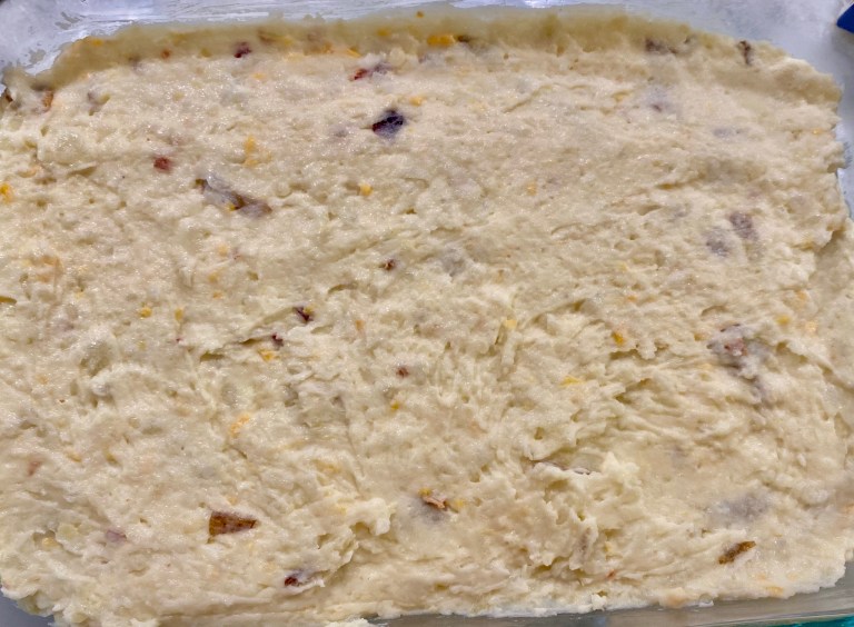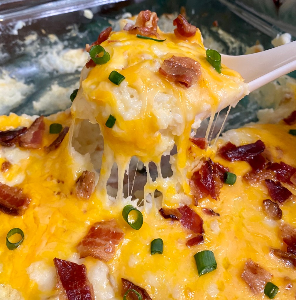 Add the potatoes to a lightly greased 9 x 13 baking dish. Top the casserole with reserved bacon and additional shredded cheese.