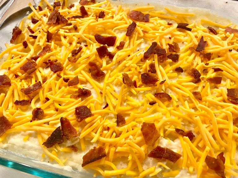 If you want to make this ahead of time, prepare the dish through everything until baking after adding the cheese and bacon. Put in fridge. When ready to bake, cover the top with aluminum foil. Bake at 350 degrees for 30-40 minutes. Make sure the cheese is melted through!