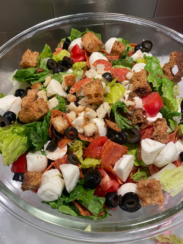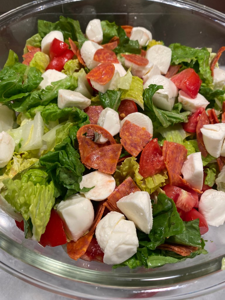 When you’re craving pizza, but trying to eat healthy, this salad has you covered. It replicates all those flavors and textures that you love, yet keeps it light.