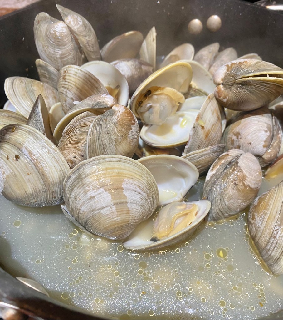 Whenever I go visit my dad on the Chesapeake Bay, I try to support his local farmers market, https://chesapeakesbounty.com/. Somehow, I can never get out of there without picking up the local clams. It’s such an easy protein to work with, and locally caught. We also go the thick-cut bacon from here too = double bonus!