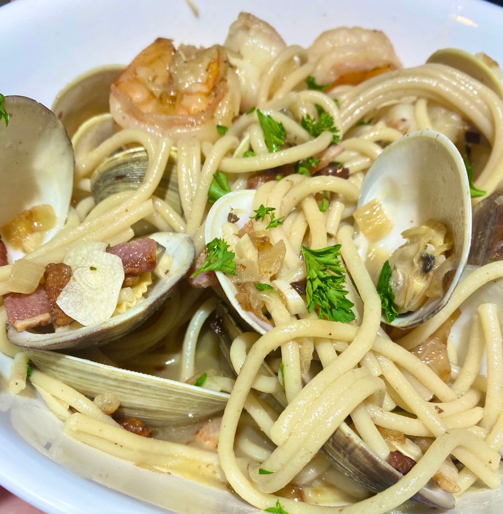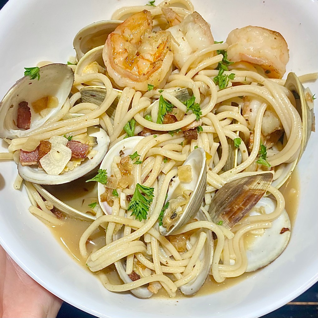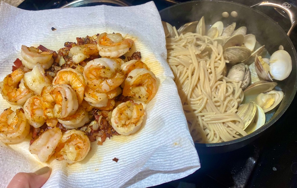 My husband isn’t much of a clam person, but luckily loves shrimp too. (They are off-season to where we are now, so had to get at the grocery store.) So we decided it was a perfect combination to have a delicious family dinner.